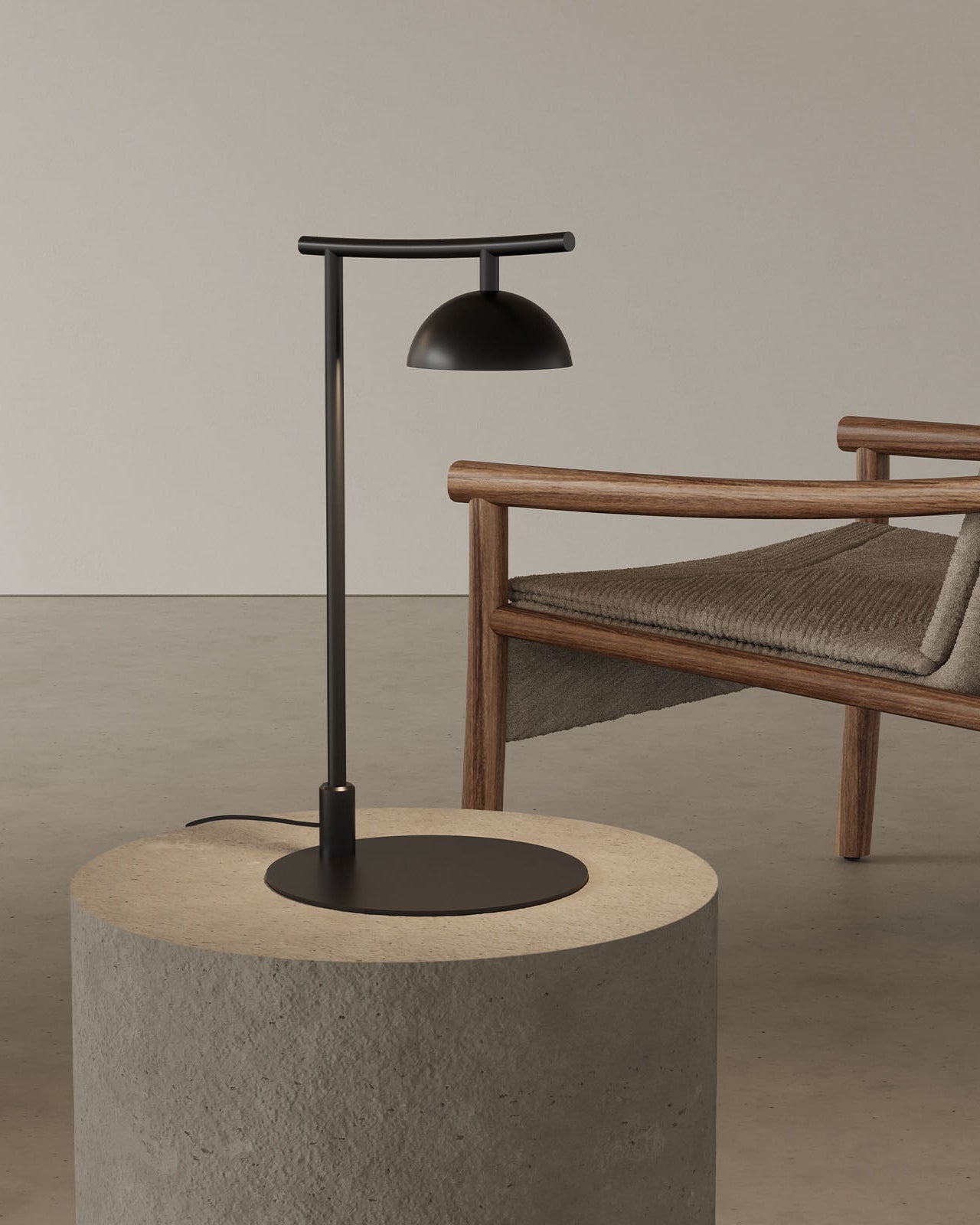 Modern black table lamp on a concrete pedestal with a wooden chair in the background.