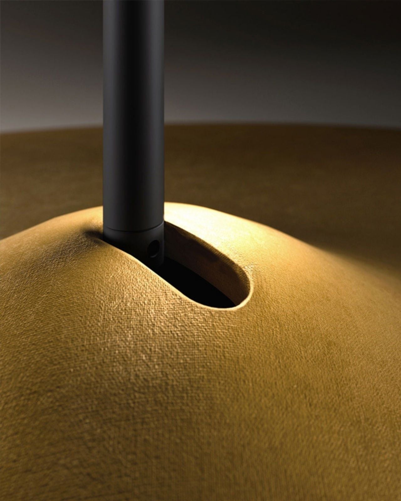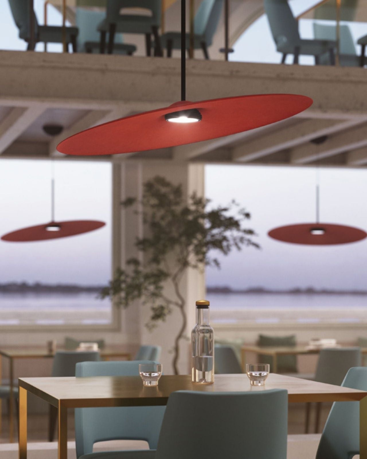 Inspired from cymbals, the modern wide and thin light shade can be tilted. It is made of recycled PET and perfectly reduces the ambient noise, reversing the drum set’s function. Along with a PPMA diffuser covering the dimmable built-in LED light, the pendant evenly distributes the light downwards, which creates a cosy, welcoming and pleasant atmosphere. This pendant light is an original eye-catching composition in your living room and is also suitable for open and busy workspaces. The shade is available in small and large sizes and in beautiful colour finishes - ocean, honey, coral, lawn green, and concrete.