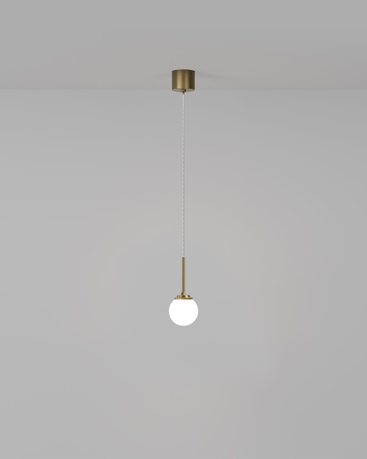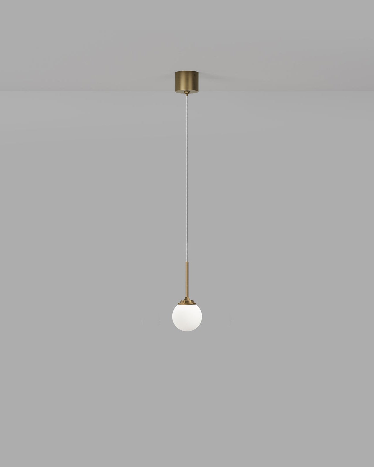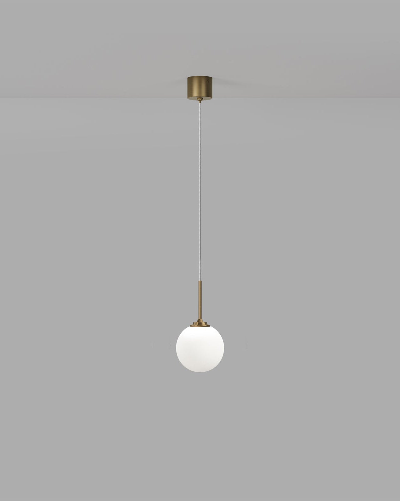 The clean, spherical form is paired with high-grade aluminium metalwork in a versatile brushed brass finish. With an IP44 moisture rating, this pendant works perfectly as a sophisticated bedside light or a functional luxury bathroom fixture.