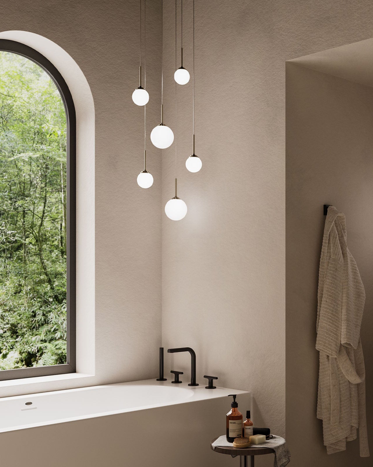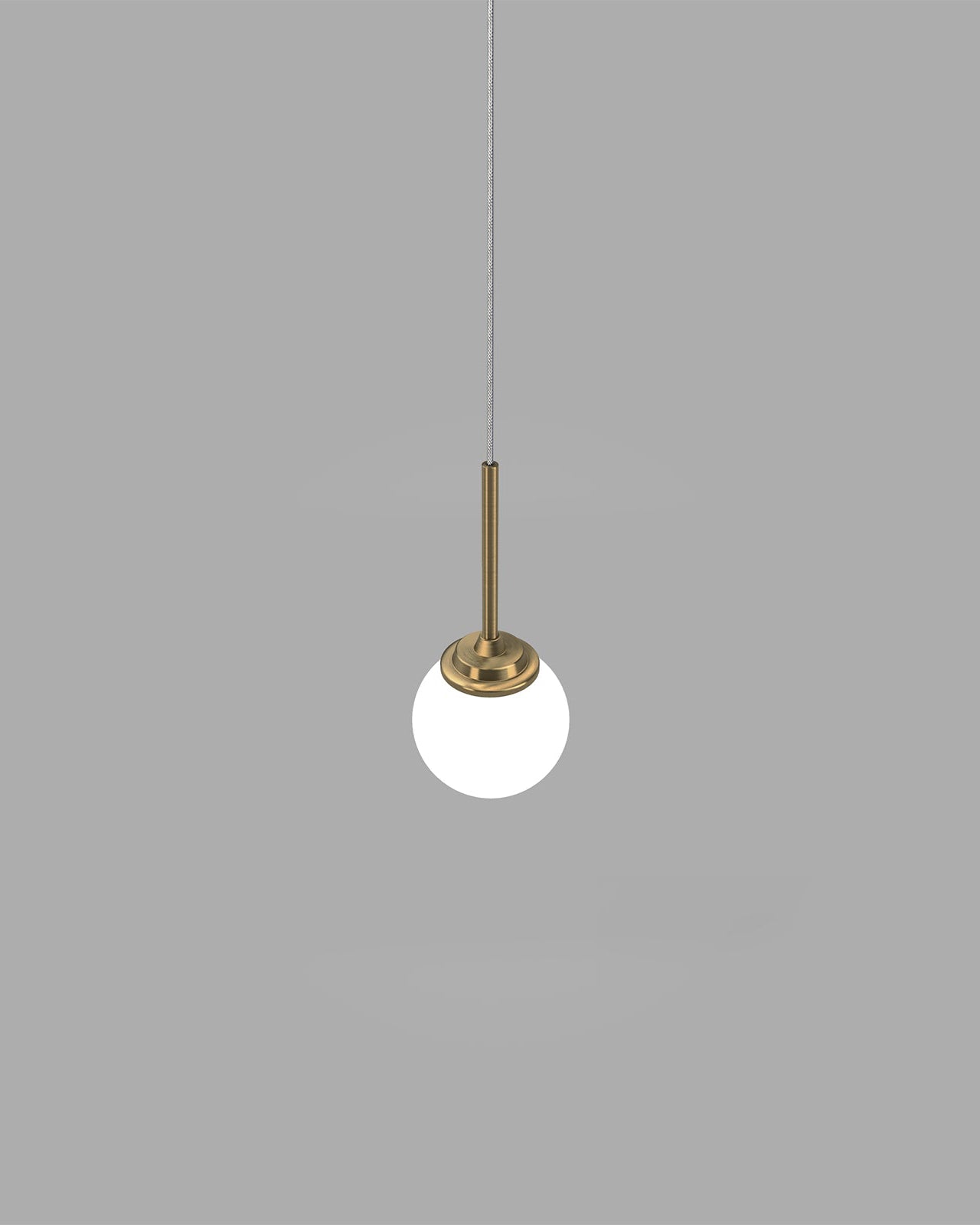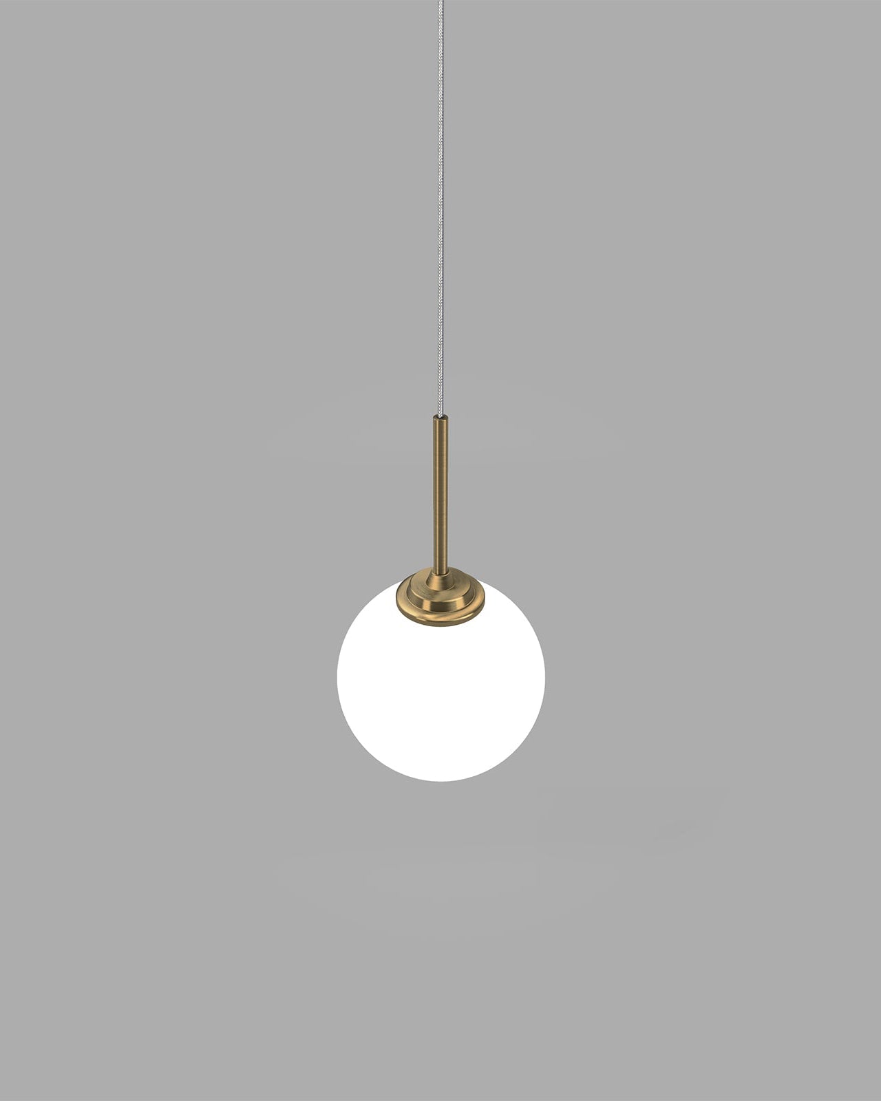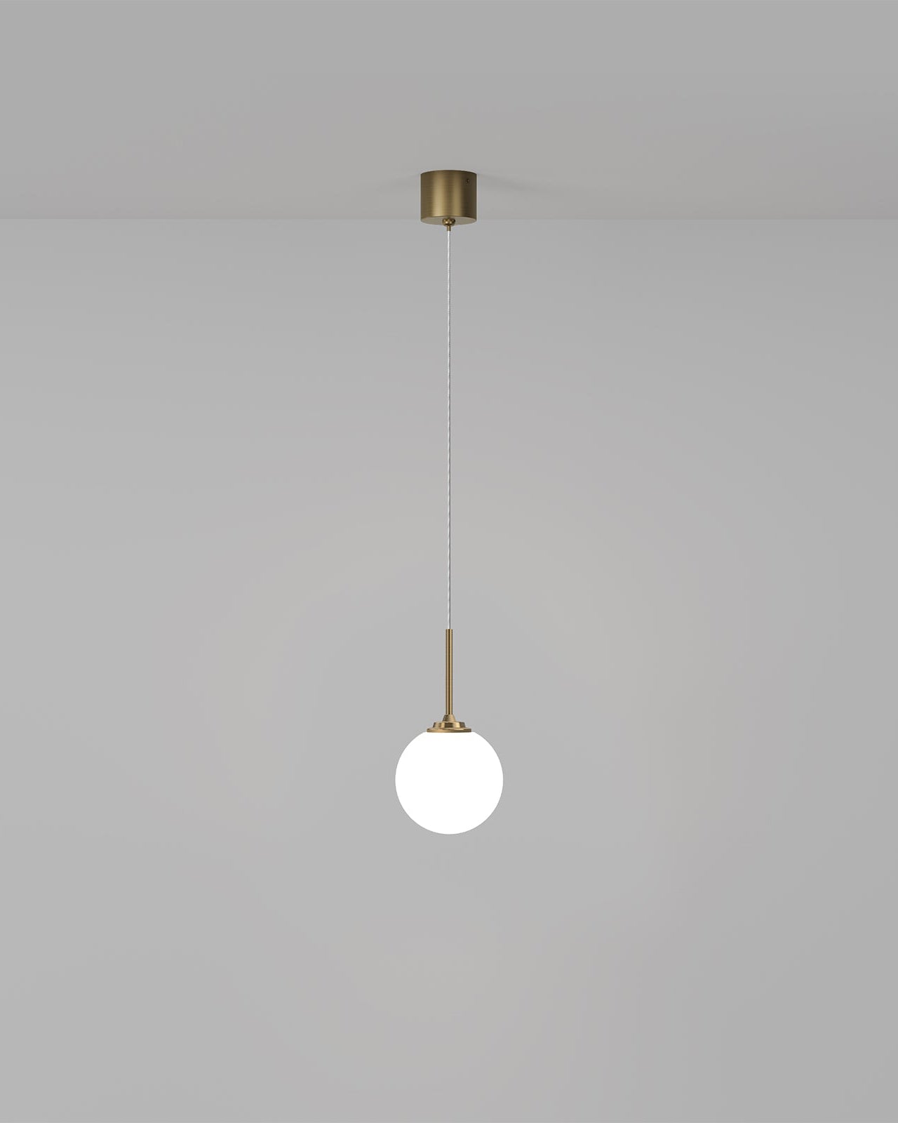 The clean, spherical form is paired with high-grade aluminium metalwork in a versatile brushed brass finish. With an IP44 moisture rating, this pendant works perfectly as a sophisticated bedside light or a functional luxury bathroom fixture.