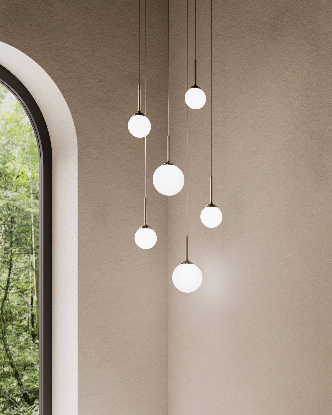 The Minimalist Sphere Orb Pendant is a masterclass in clean, architectural glass design. Featuring a hand-finished frosted opal sphere, this fixture provides a soft, 360-degree diffusion. It is the ideal anchor for intimate living rooms or grand-scale stairwells or entryways.