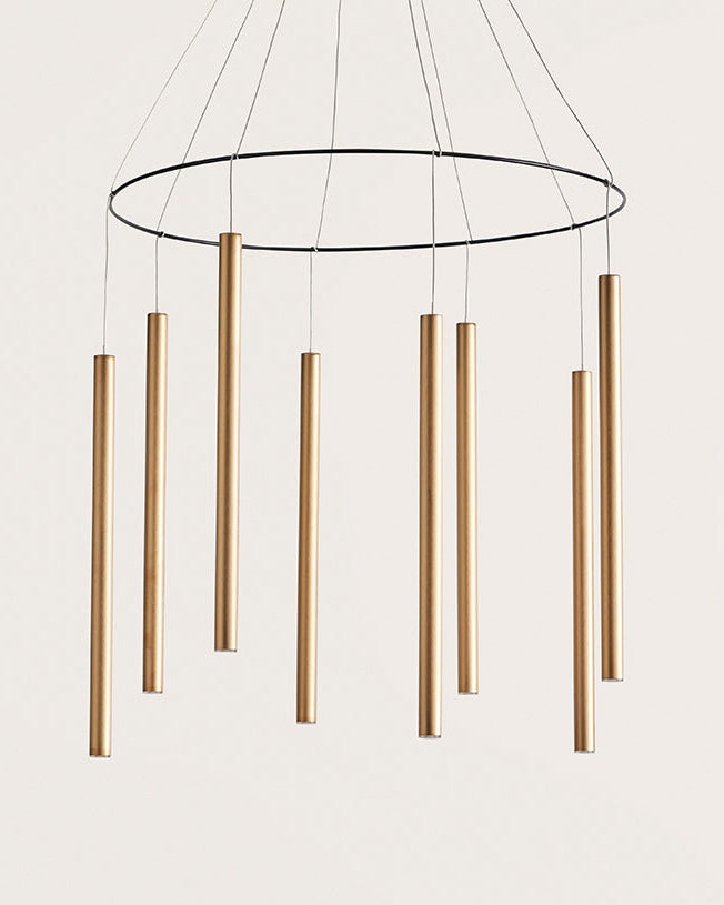Designed in Spain its simplistic form consists of eight tubular shades suspended from a steel 600mm ring and a black ceiling plate. Featured with eight integrated COB LED's this contemporary take on a chandelier will become a focal point within any interior. Reminiscent of wind-chimes the Minimalist Rod Chandelier will bring an air of luxury and charm to large spaces. Available in assorted steel finishes.
