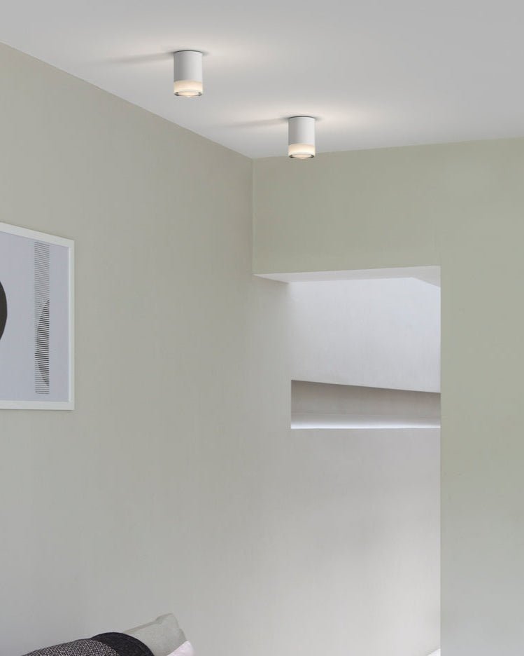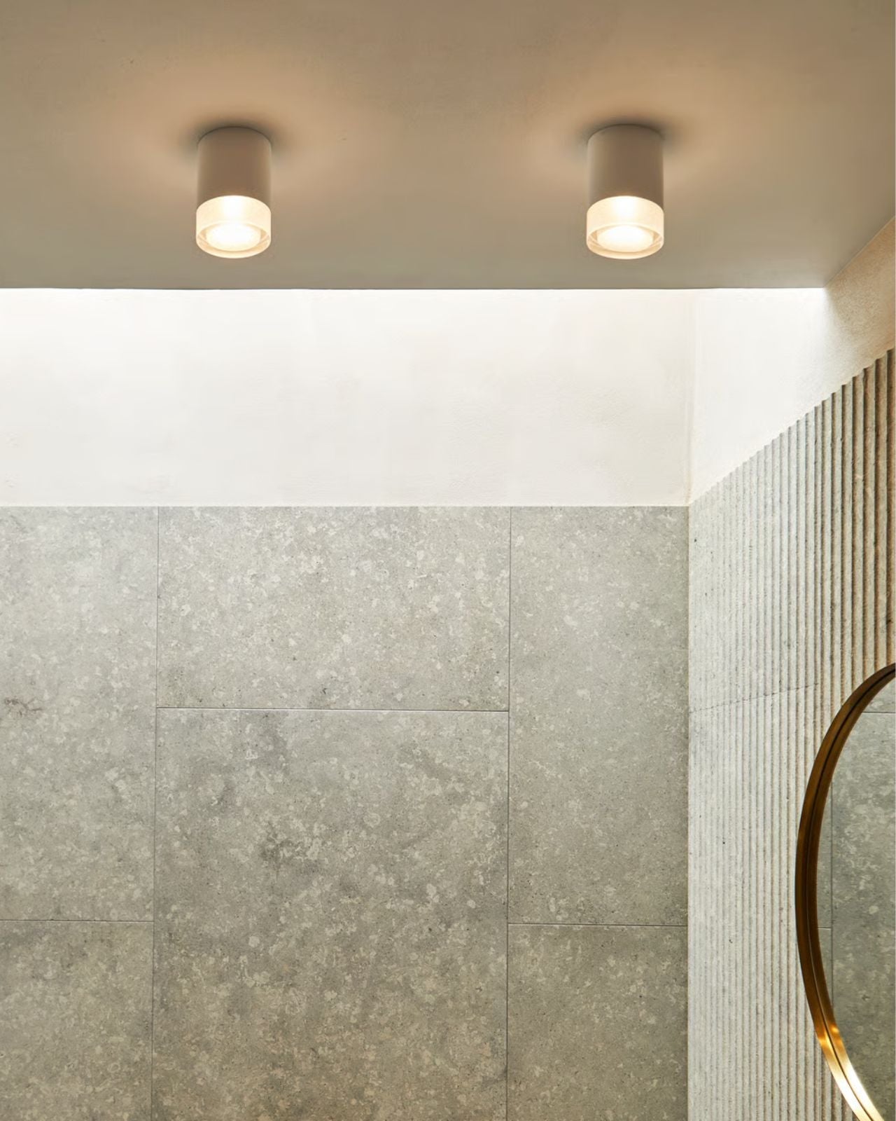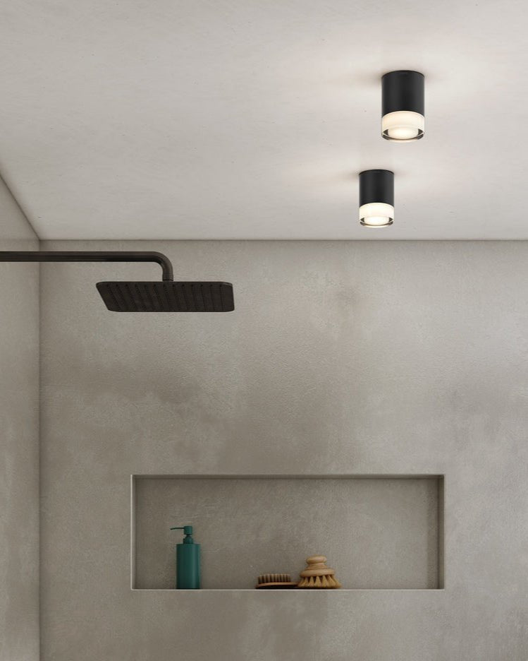 The Modern Bathroom Ceiling Light is a unique sleek design, available in black or white. Featuring thick etched glass diffusers that resemble the glass blocks of the mid 1900's, this fitting utilises retro design elements, reimagined to create a modern cylindrical ceiling light. With an IP rating of IP65, this is a versatile surface-mounted fitting suitable for bathrooms, patios and hallways.
