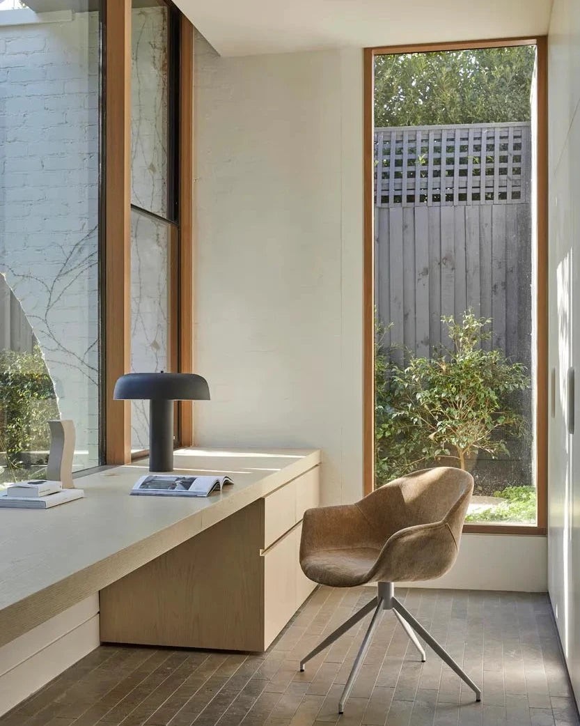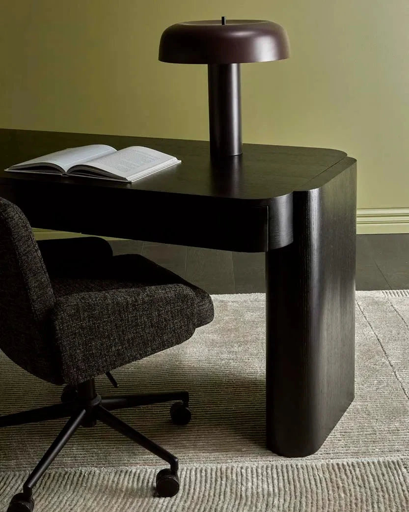 This modern table lamp features a sleek base paired with an overhanging canopy shade, creating a clean and balanced silhouette. Available in Black, White, Burgundy, and Taupe, the design offers a streamlined appearance that suits a range of contemporary and mid-century interiors. Well suited to offices and living areas, it provides practical illumination while maintaining a considered, modern presence.