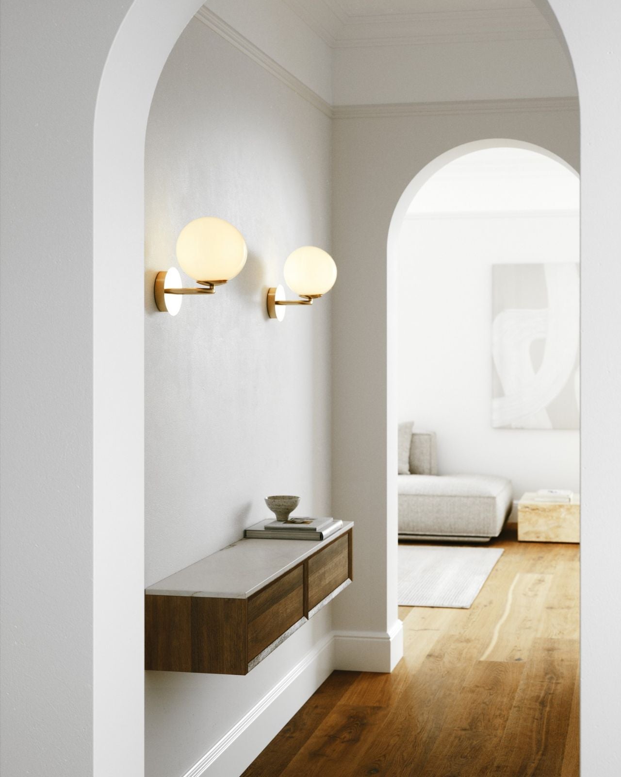 Inspired by the elegance of organic jewellery, the Mouth-blown Asymmetrical Glass Wall Light features a unique, asymmetrical opal glass shade. Its orb-like form is crafted using traditional mouth-blowing techniques, giving each shade a distinct shape. This wall light creates a soft, diffused glow that fills the room. The polished brass base adds a warm, refined contrast, making it a sculptural yet functional piece ideal for bedrooms, living areas, or hallways.