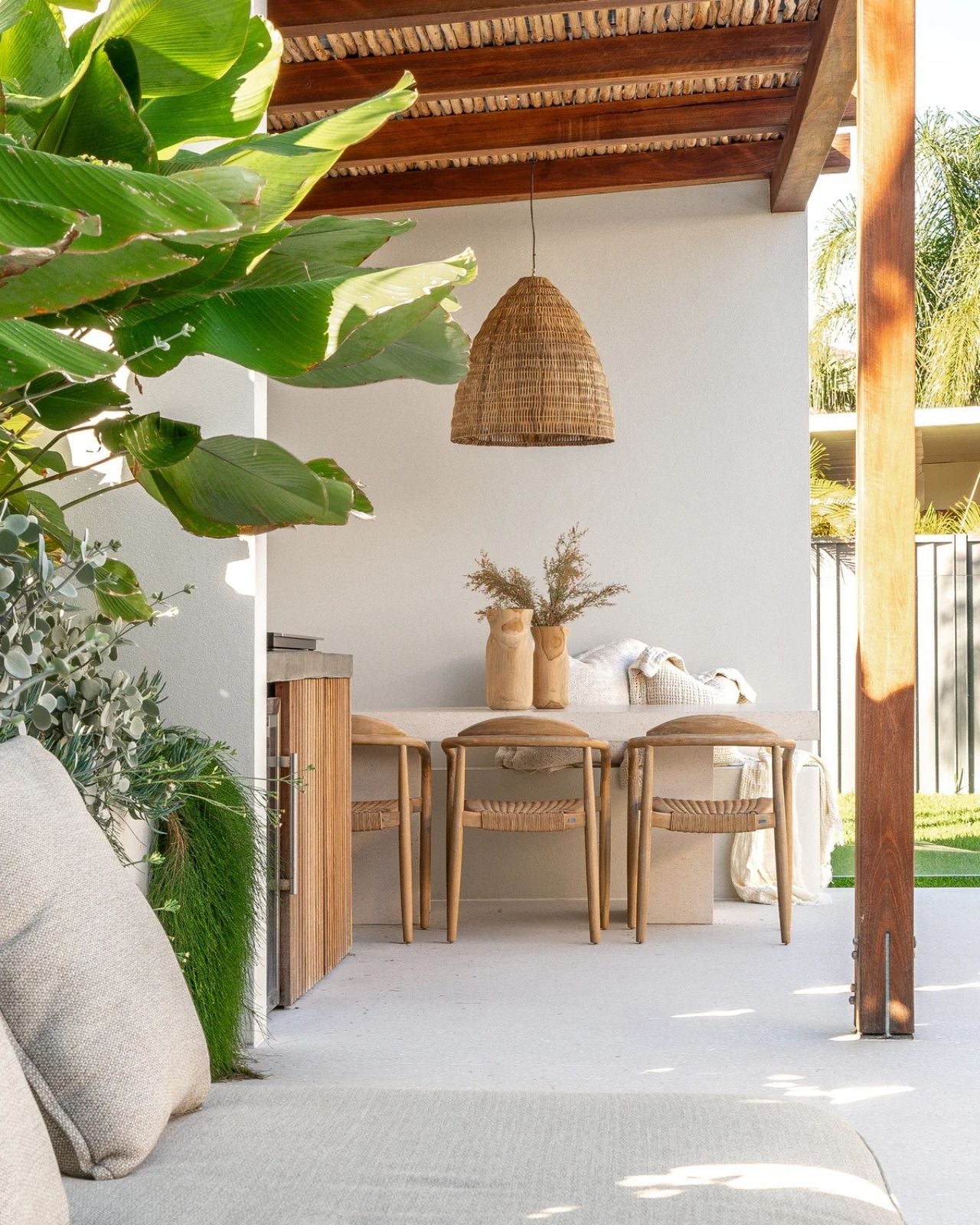 Natural Rattan Folk Pendant Light | Lighting Collective | Pendant Above Outside Dining Table Under Verandah