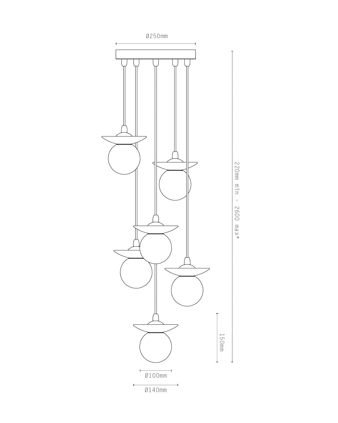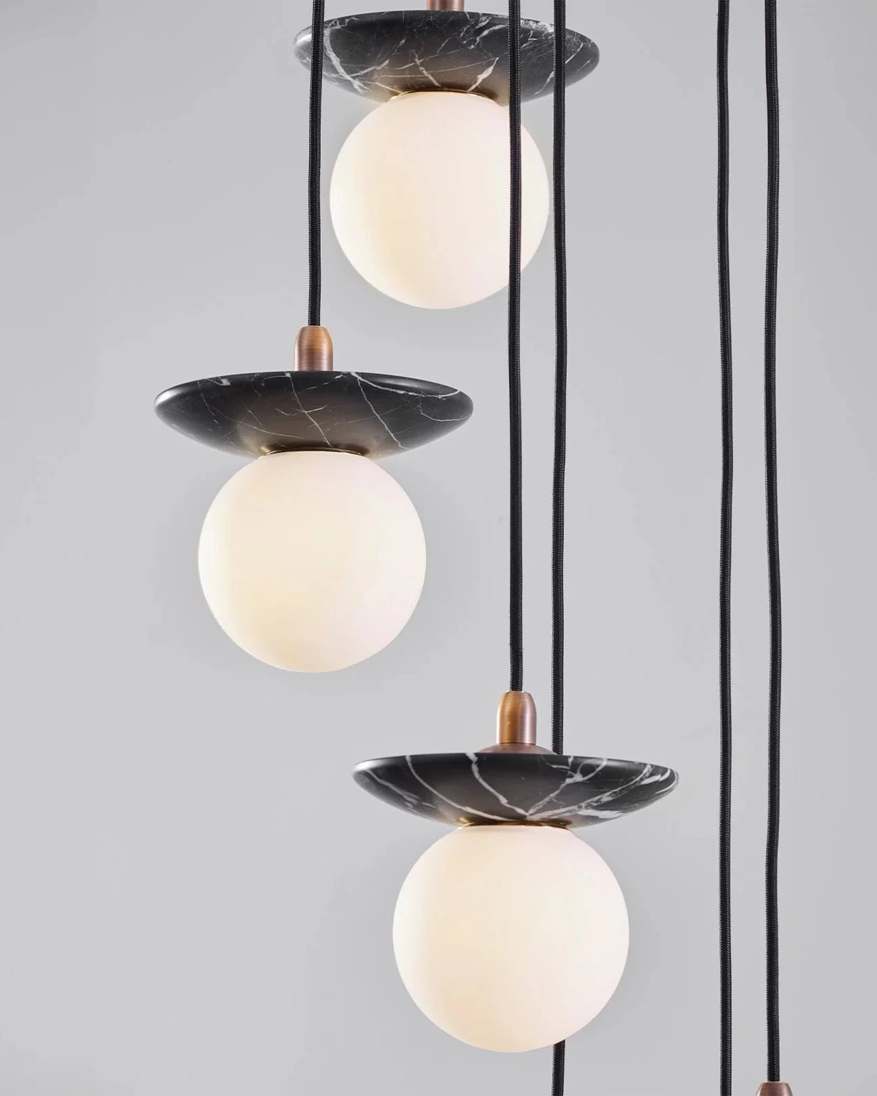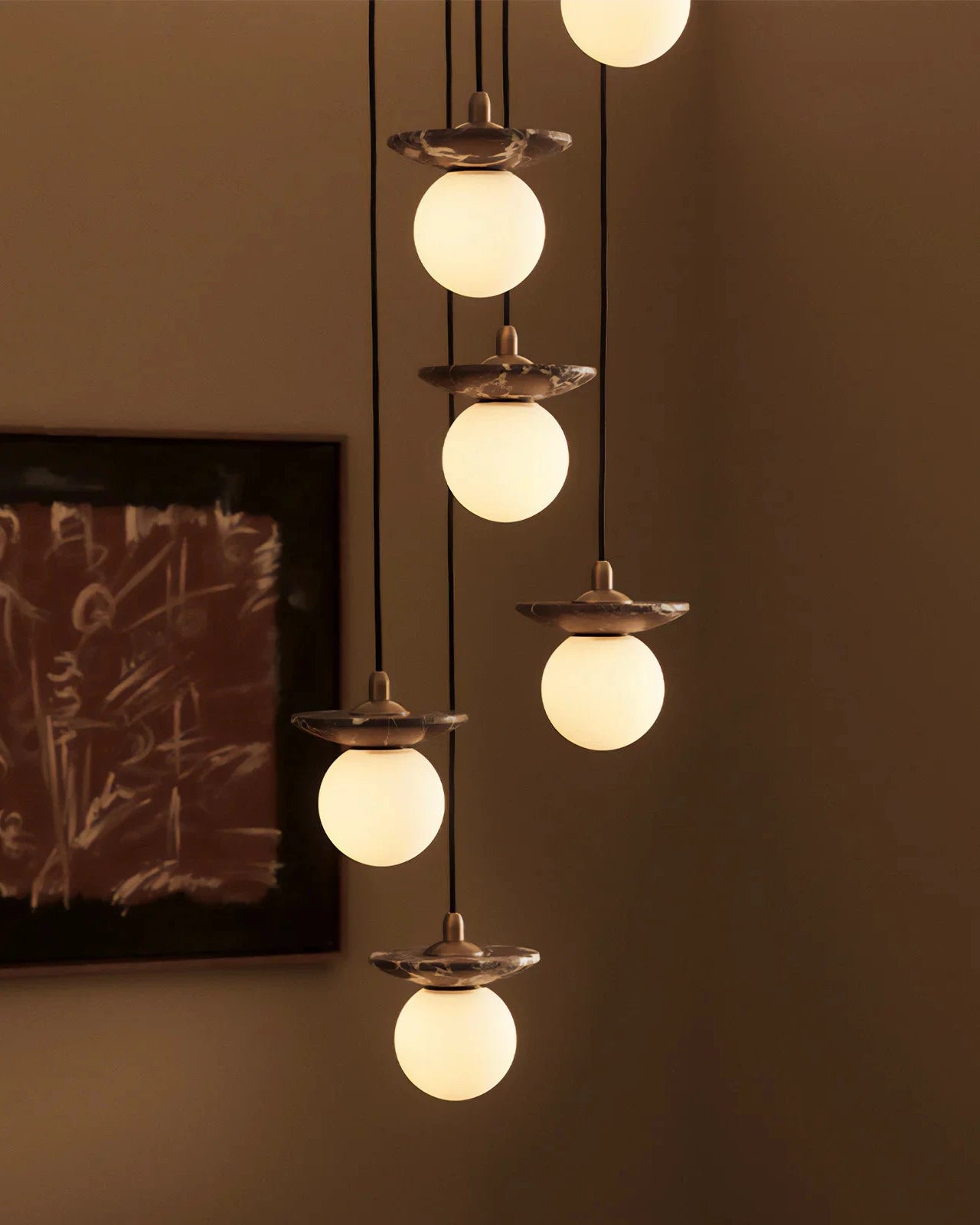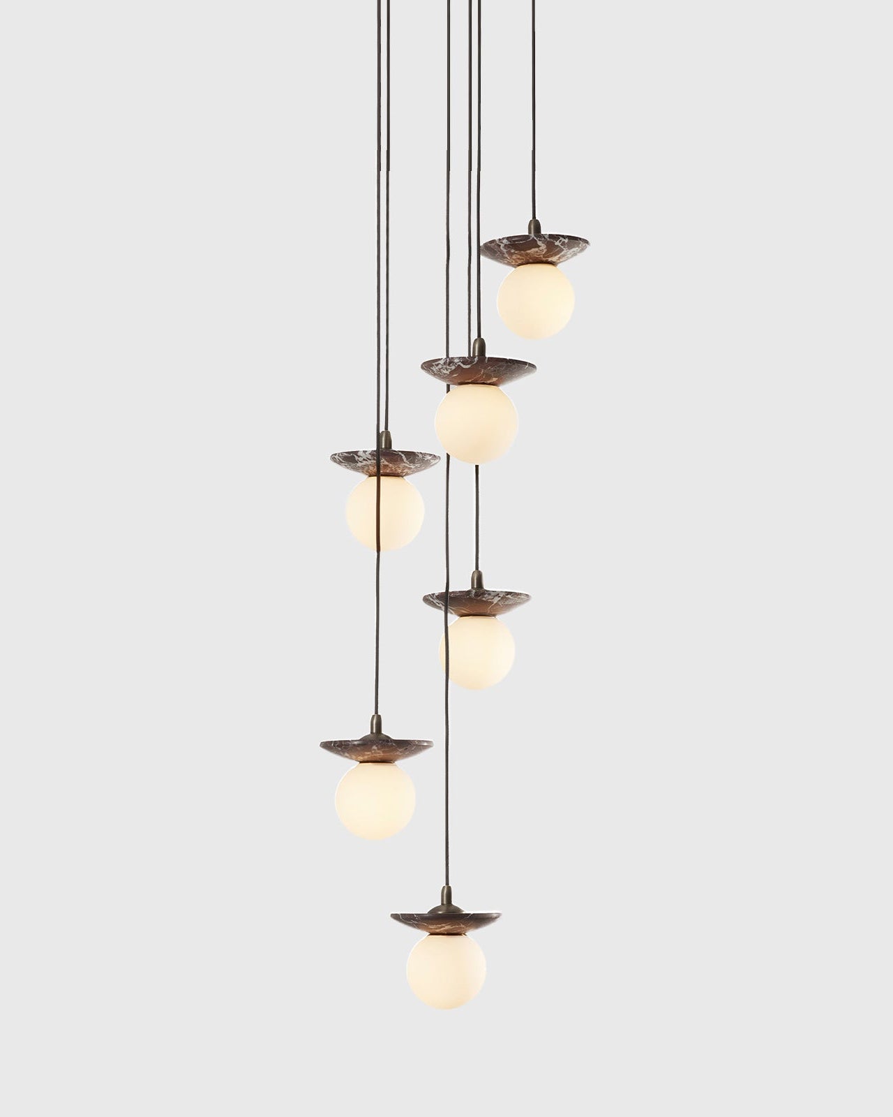 Crafted in England from solid brass, this six-light statement piece features opal glass spheres paired with natural stone discs and refined cord-grip detailing. Designed for dining rooms and open-plan interiors, it provides soft, diffused illumination that enhances social and architectural spaces.