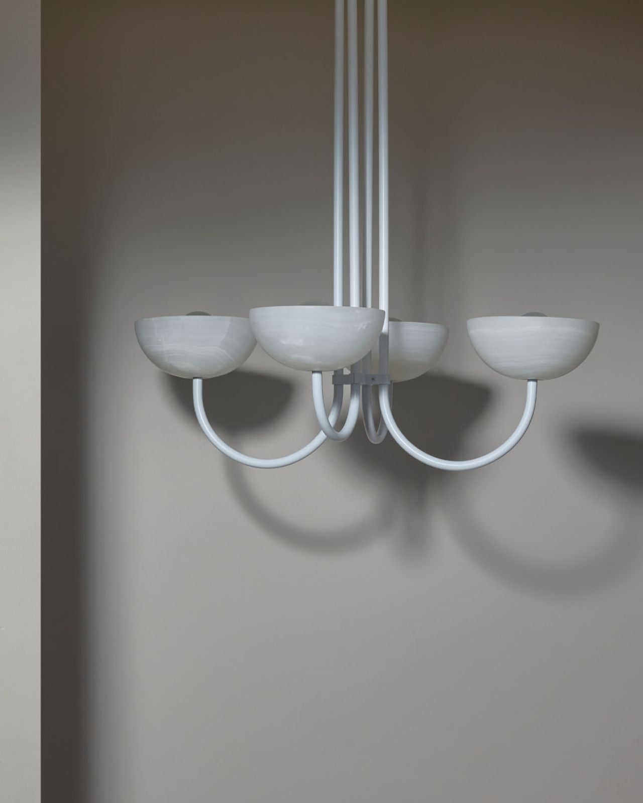 The Onyx Stone Narrow Quad Dome Chandelier | Aurelia is a contemporary version of a classic chandelier with shades turned upside down for stunning soft illumination. This fixture is made from glass, jade or white onyx and is paired with solid metal rods available in four finishes, brass, brushed black, brushed nickel or satin white. Ideal in living rooms, dining rooms or restaurants, this pendant will bring a celestial and refined touch to the surroundings.