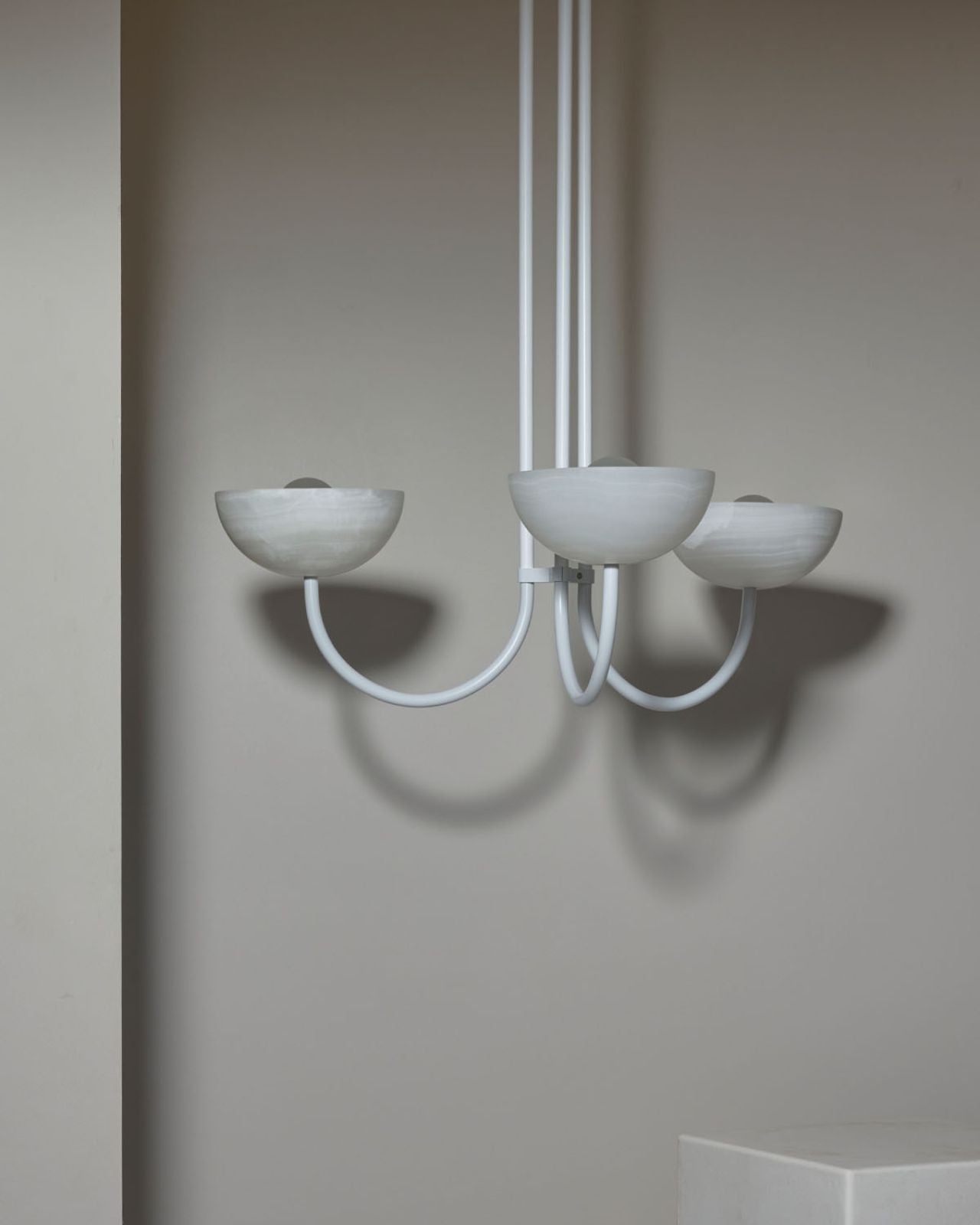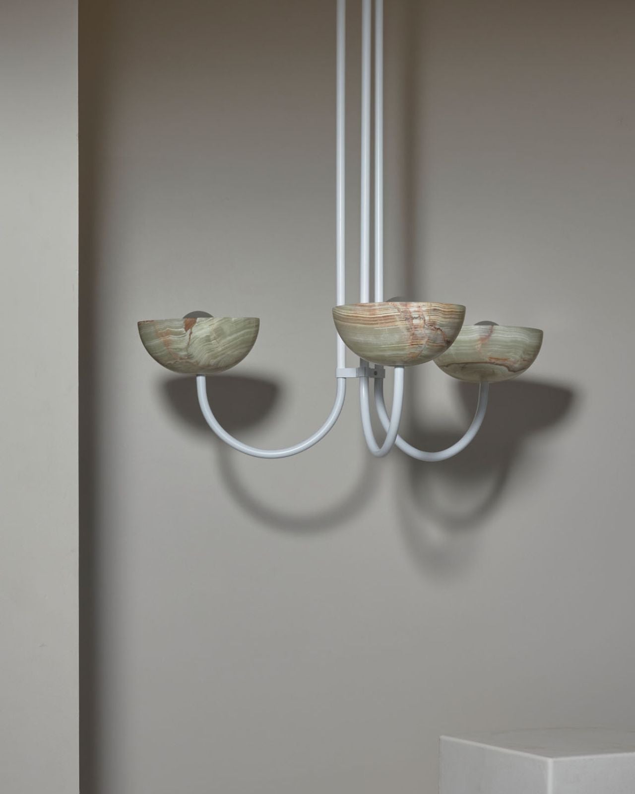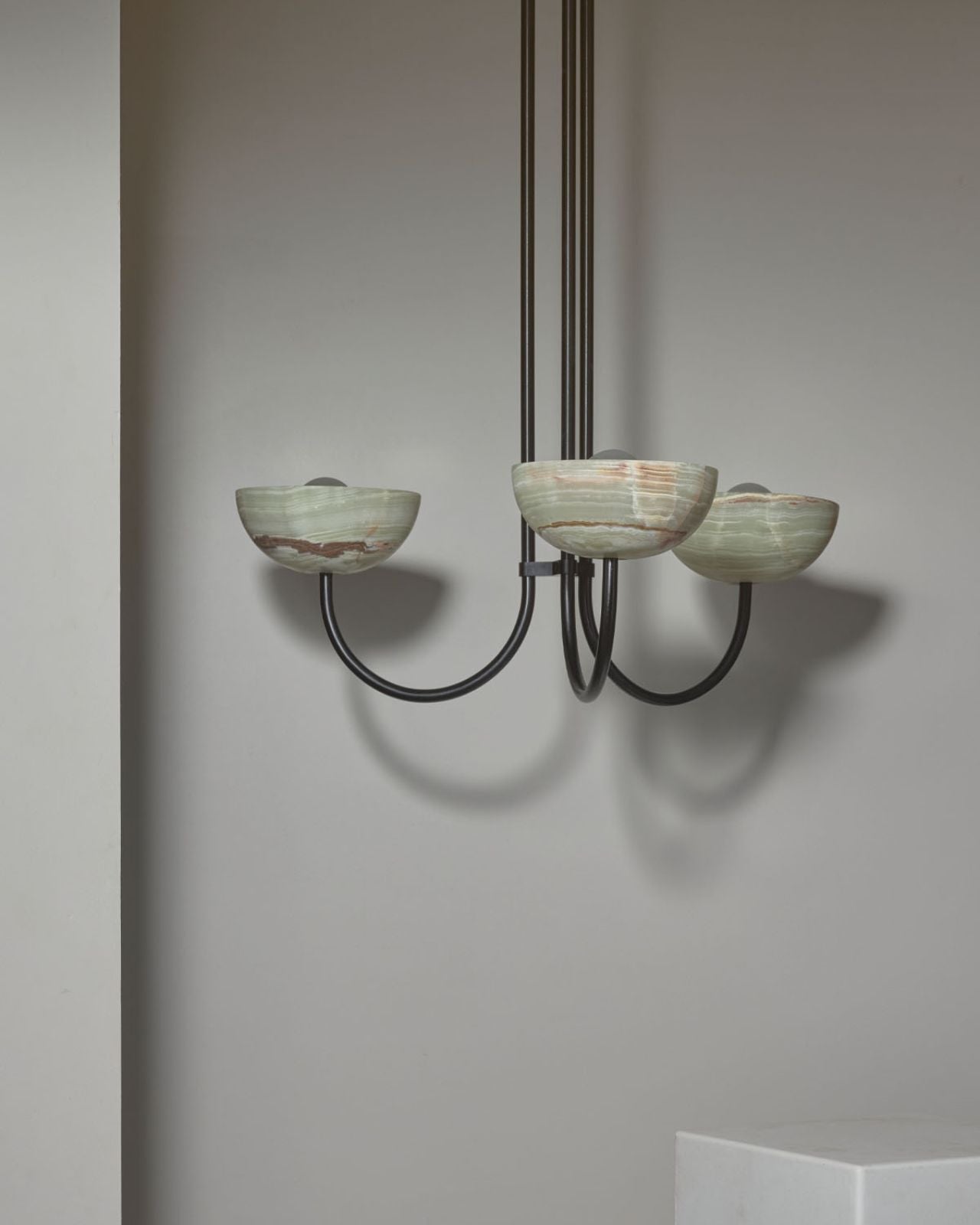 This triple dome pendant is a contemporary version of a classic chandelier with shades turned upside down for stunning soft illumination. This fixture is made from glass, jade or white onyx and is paired with solid metal rods available in four finishes, brass, brushed black, brushed nickel or satin white and two different sizes. Ideal in living rooms, dining rooms or restaurants, this pendant will bring a celestial and refined touch to the surroundings.