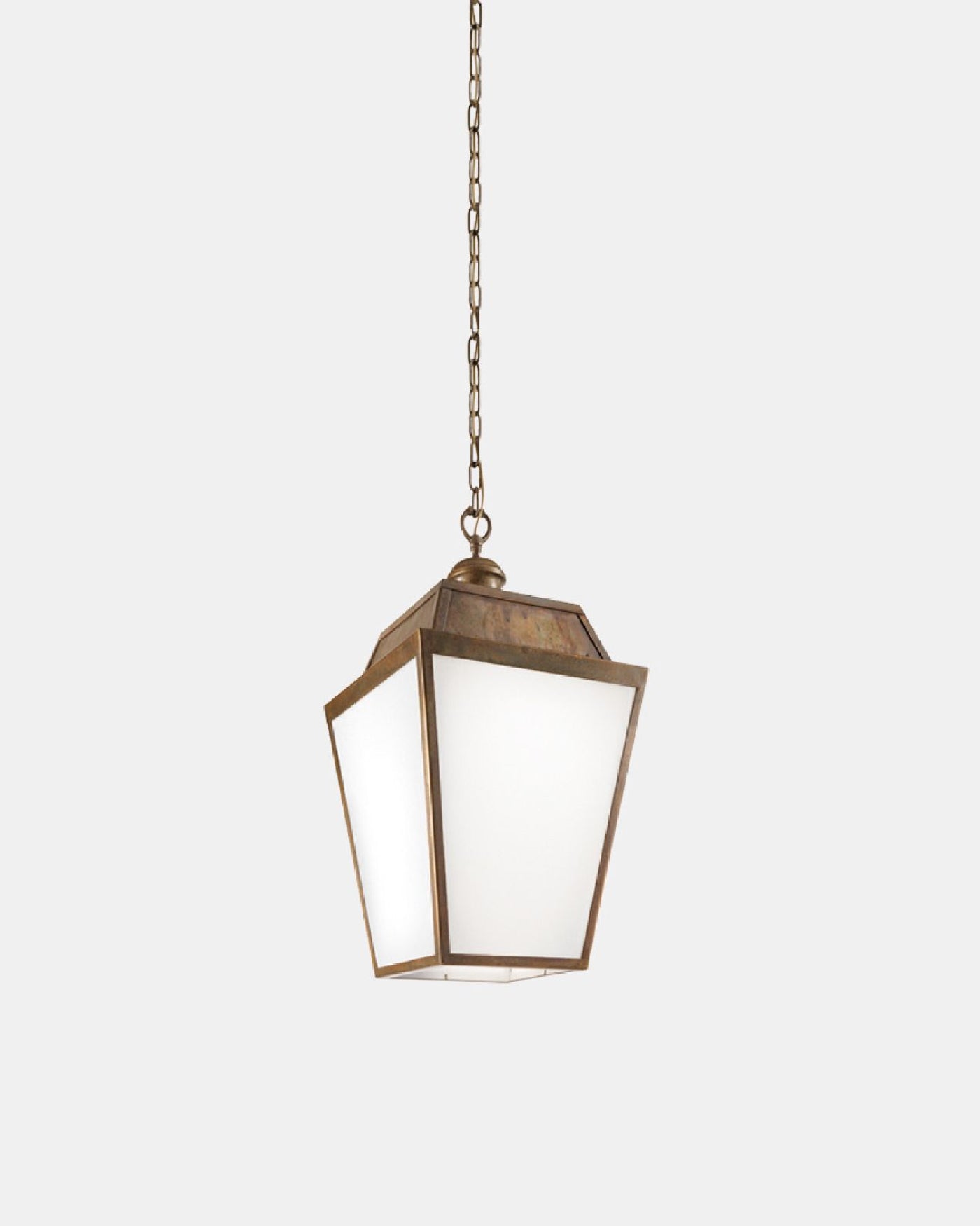 This outdoor pendant light is made from pre-aged brass, featuring a chain that can be adjusted to suit the space perfectly suited for installation at the front entrance of a house or in an open verandah. The Pre-Aged Brass Exterior Lantern Pendant pendant is available in two finishes, white or transparent.