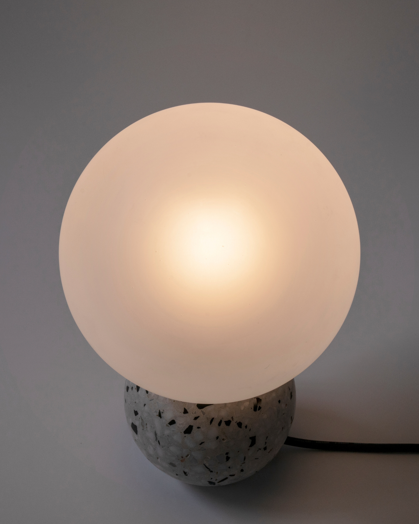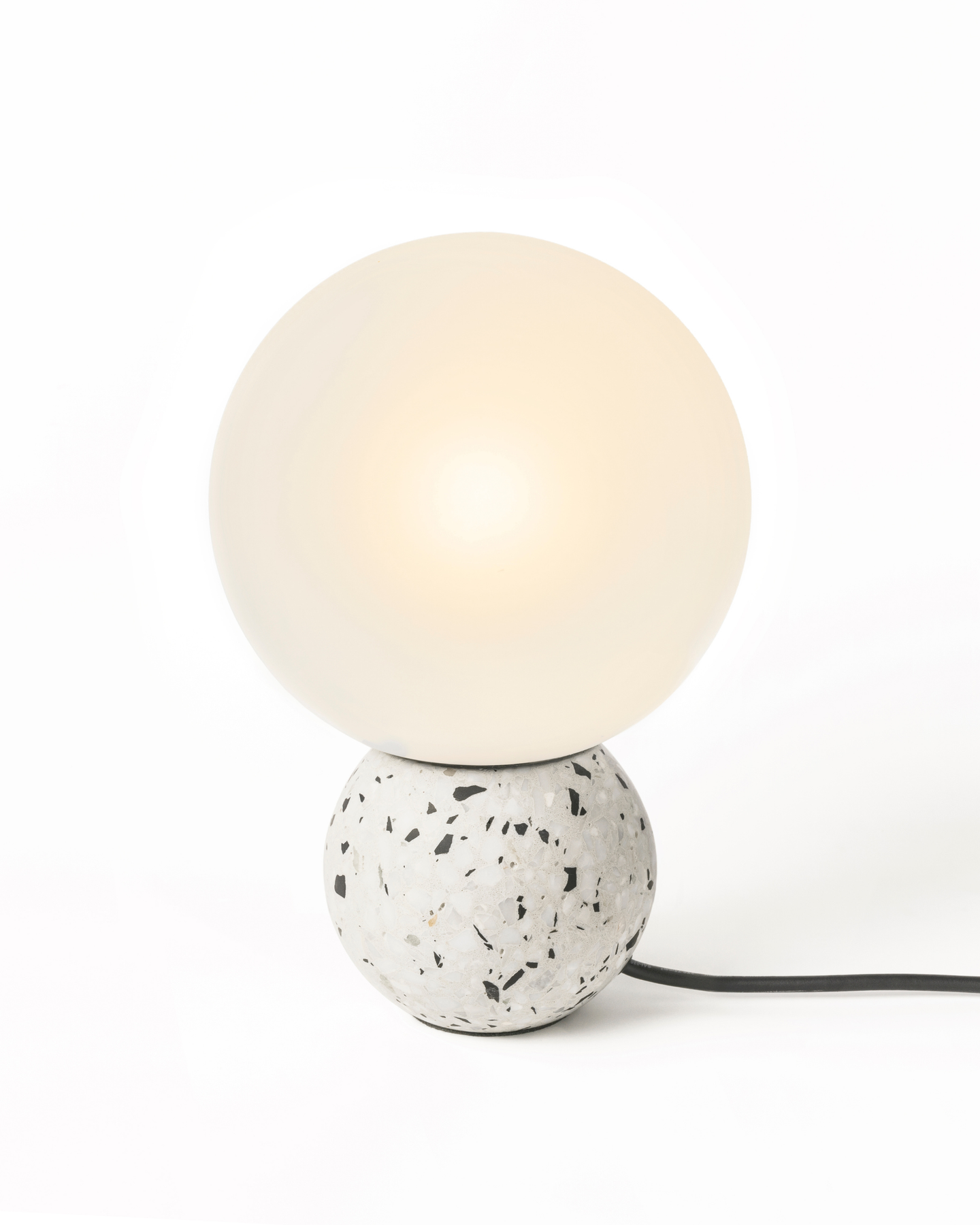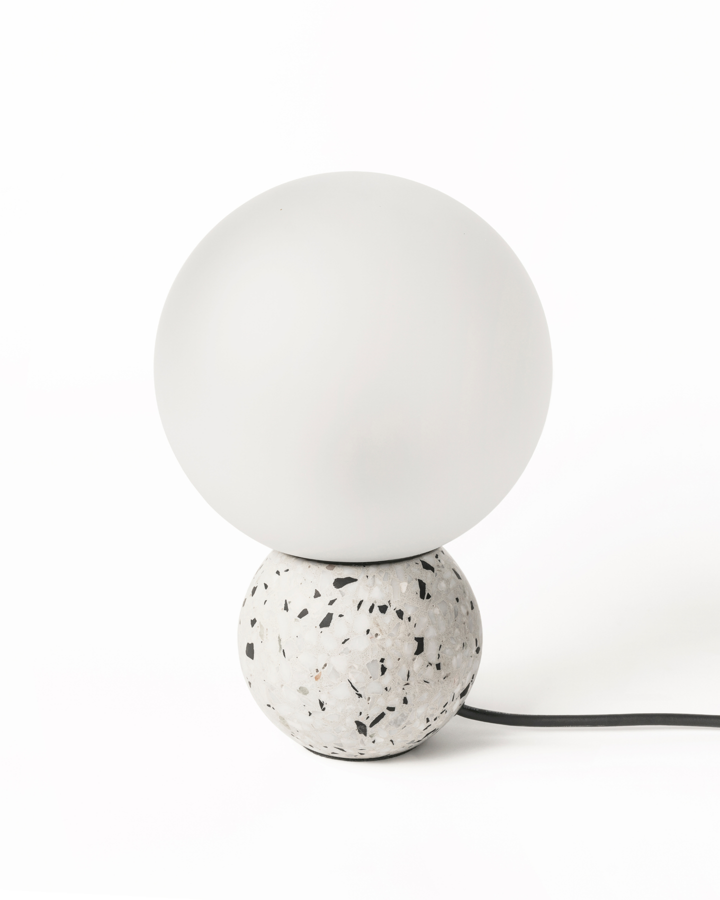 A modern take on the traditional table lamp, this fitting is composed of a recycled stone aggregate spherical base supporting a round frosted glass light. Ideally suited for enhancing hallways and living areas of modern interiors.