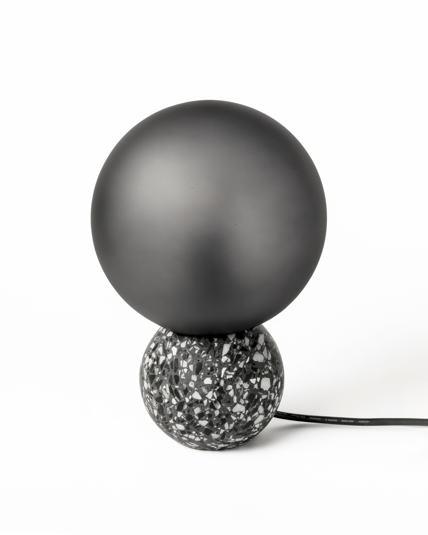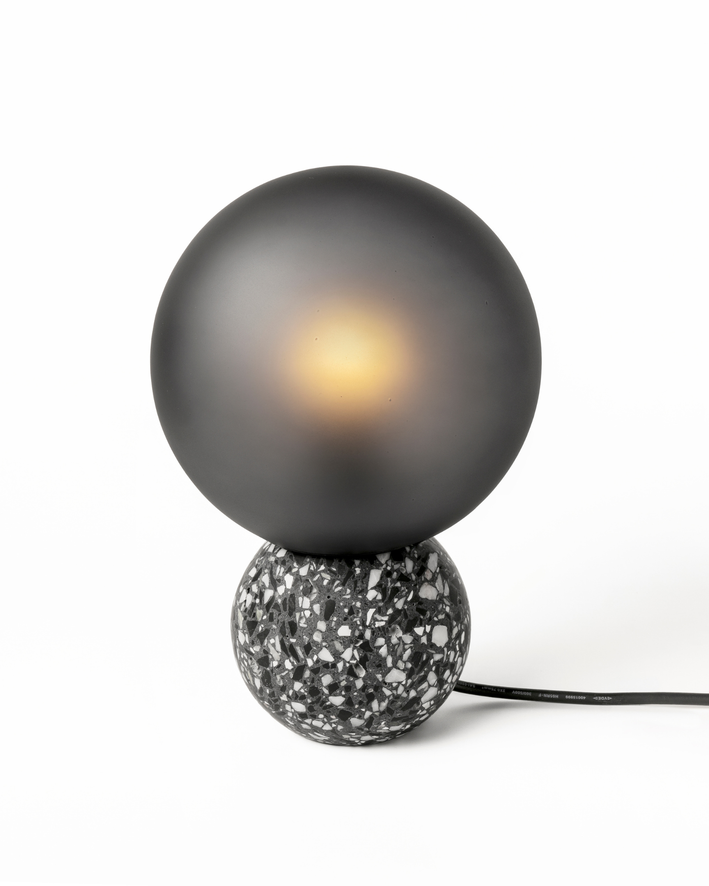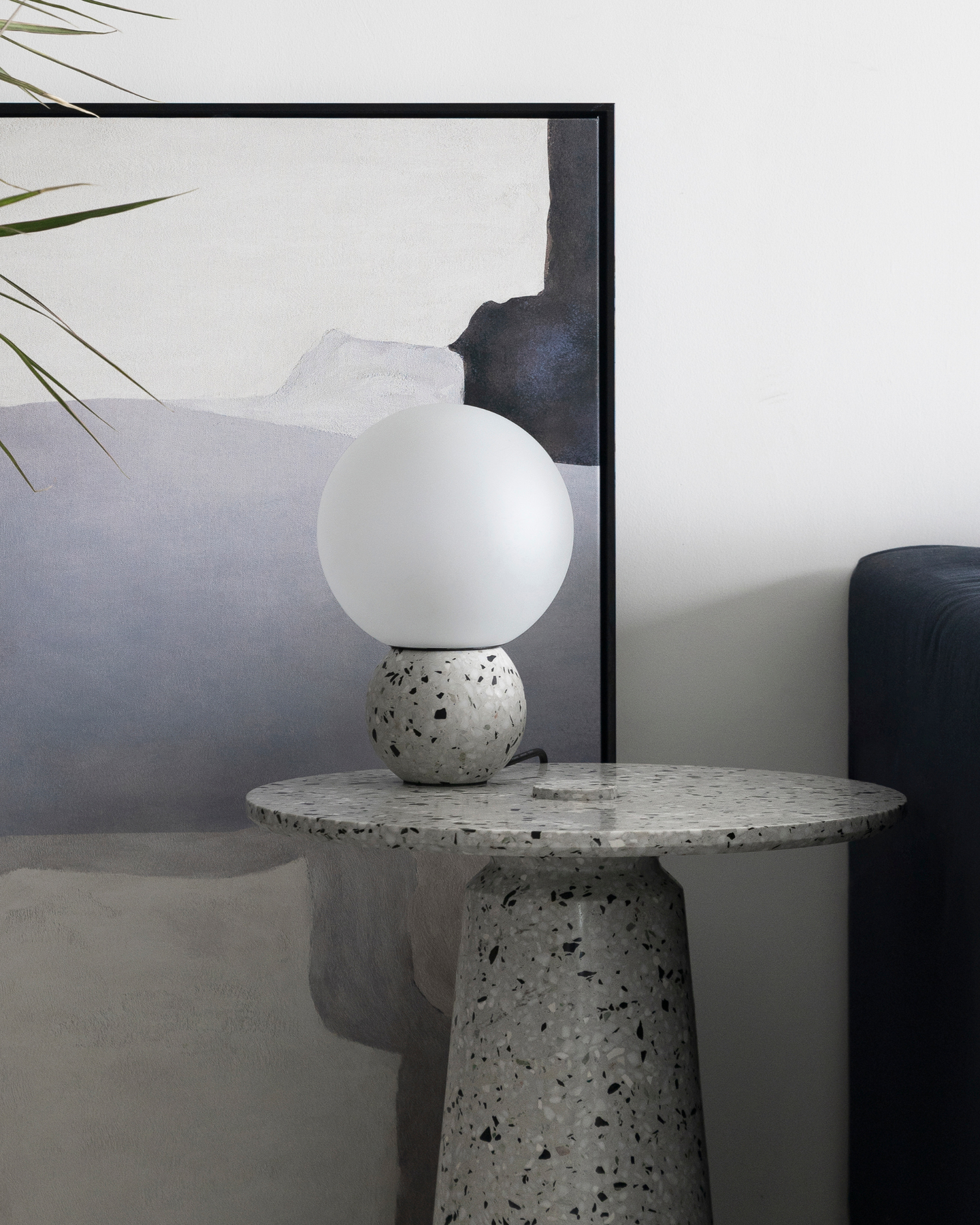 A modern take on the traditional table lamp, this fitting is composed of a recycled stone aggregate spherical base supporting a round frosted glass light. Ideally suited for enhancing hallways and living areas of modern interiors.