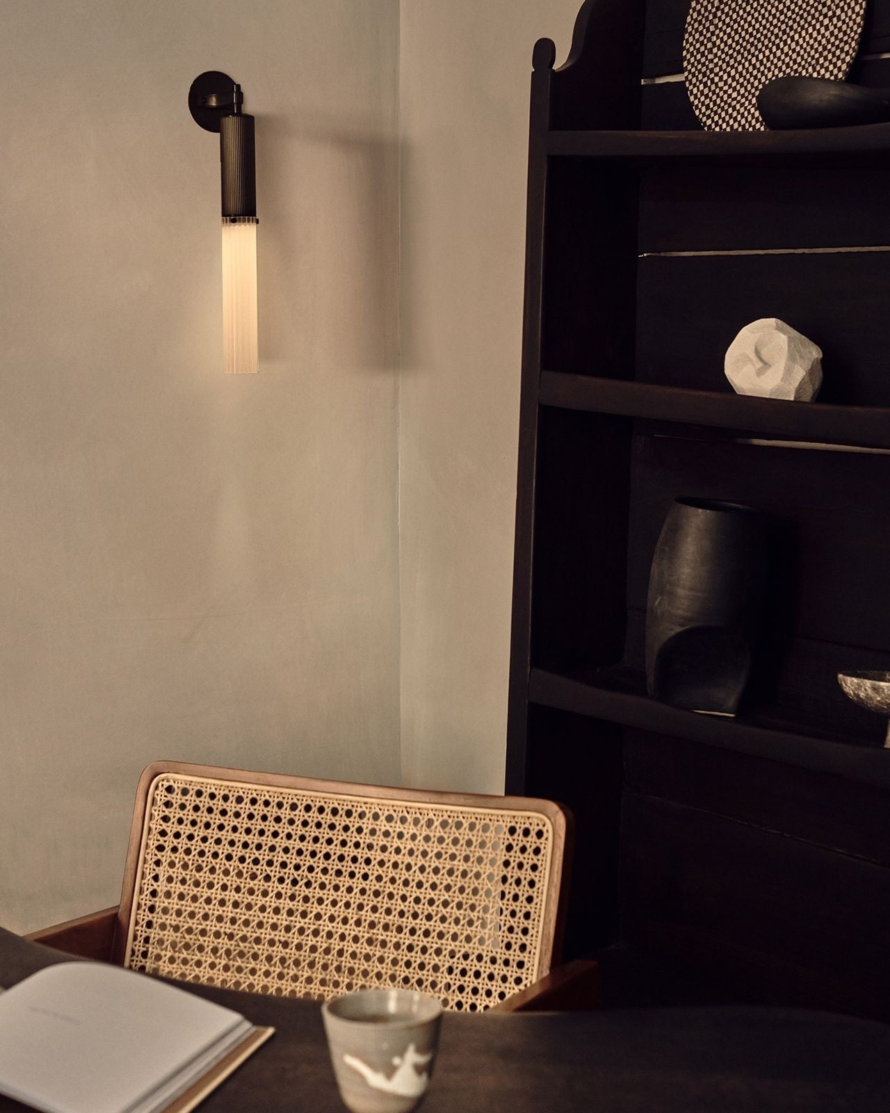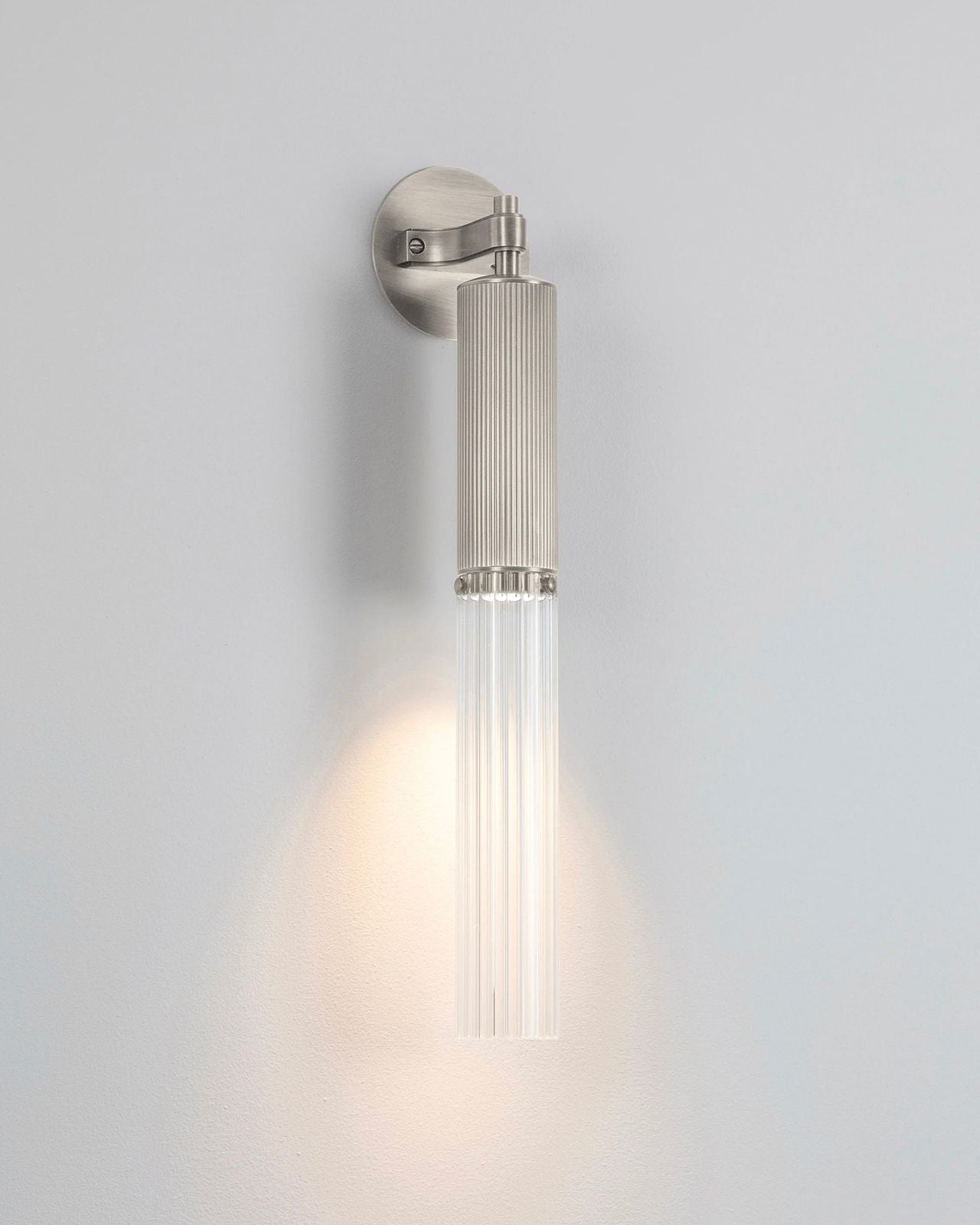 Emanating a delicate and soft warm light through a cylindrical reeded clear or frosted glass and brass shade, this wall light will easily enhance any modern and contemporary interior space. Made in England Bringing an elegant touch inspired from Mid-Century and Art Deco eras, this slim fixture is available in IP20 or IP44 version, making it perfect for corridors, bedrooms but also bathrooms. To suit any room style, the brass structure is available in antique brass, satin brass, bronze or satin nickel finish.