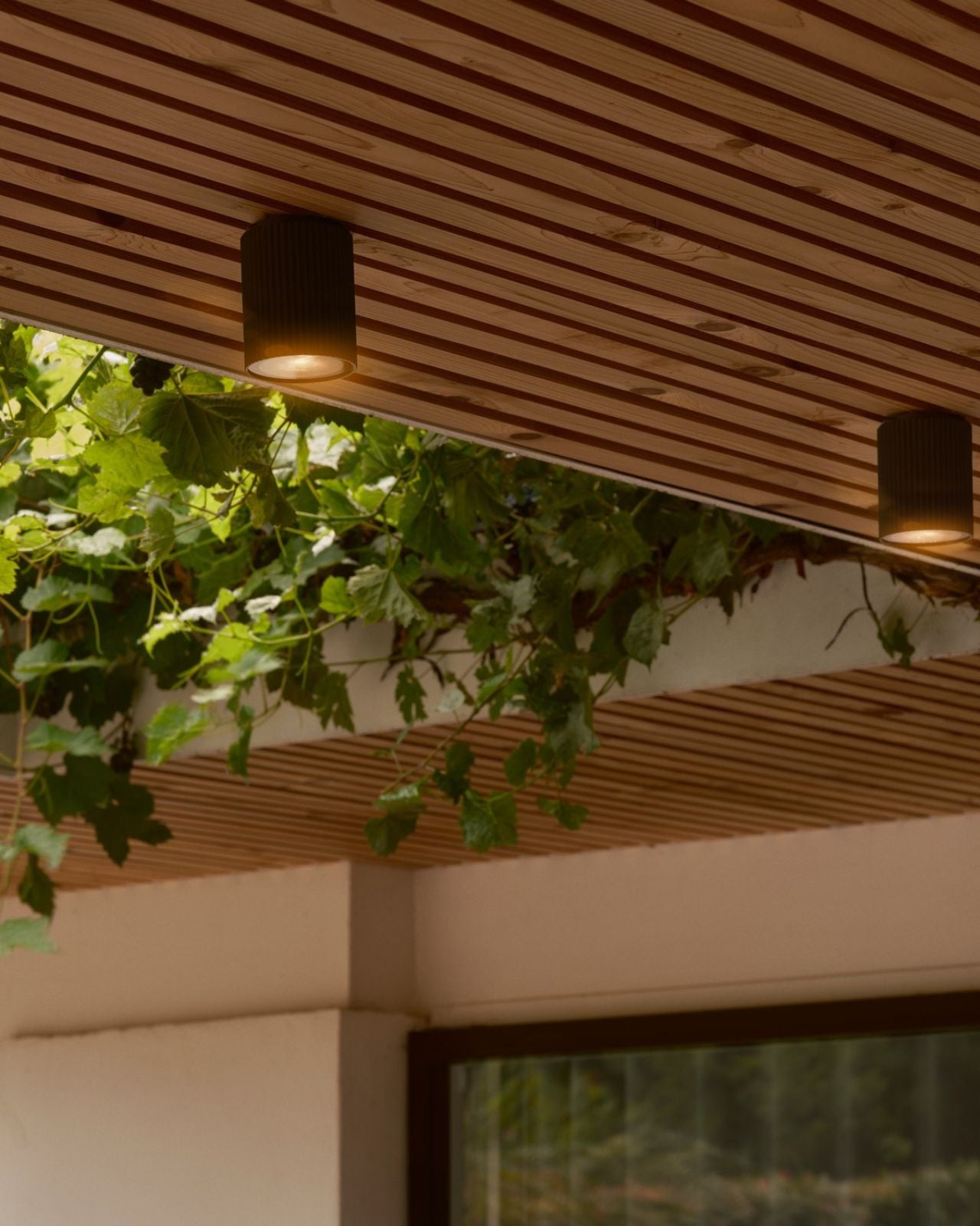 Made from black aluminium with a rippled surface, this Danish-designed ceiling light uses a GU10 bulb (not included), is dimmable with a compatible bulb, and features an IP54 rating, making it suitable for sheltered outdoor use. Its minimalist design and clean lines make it a perfect choice for contemporary exteriors.
