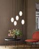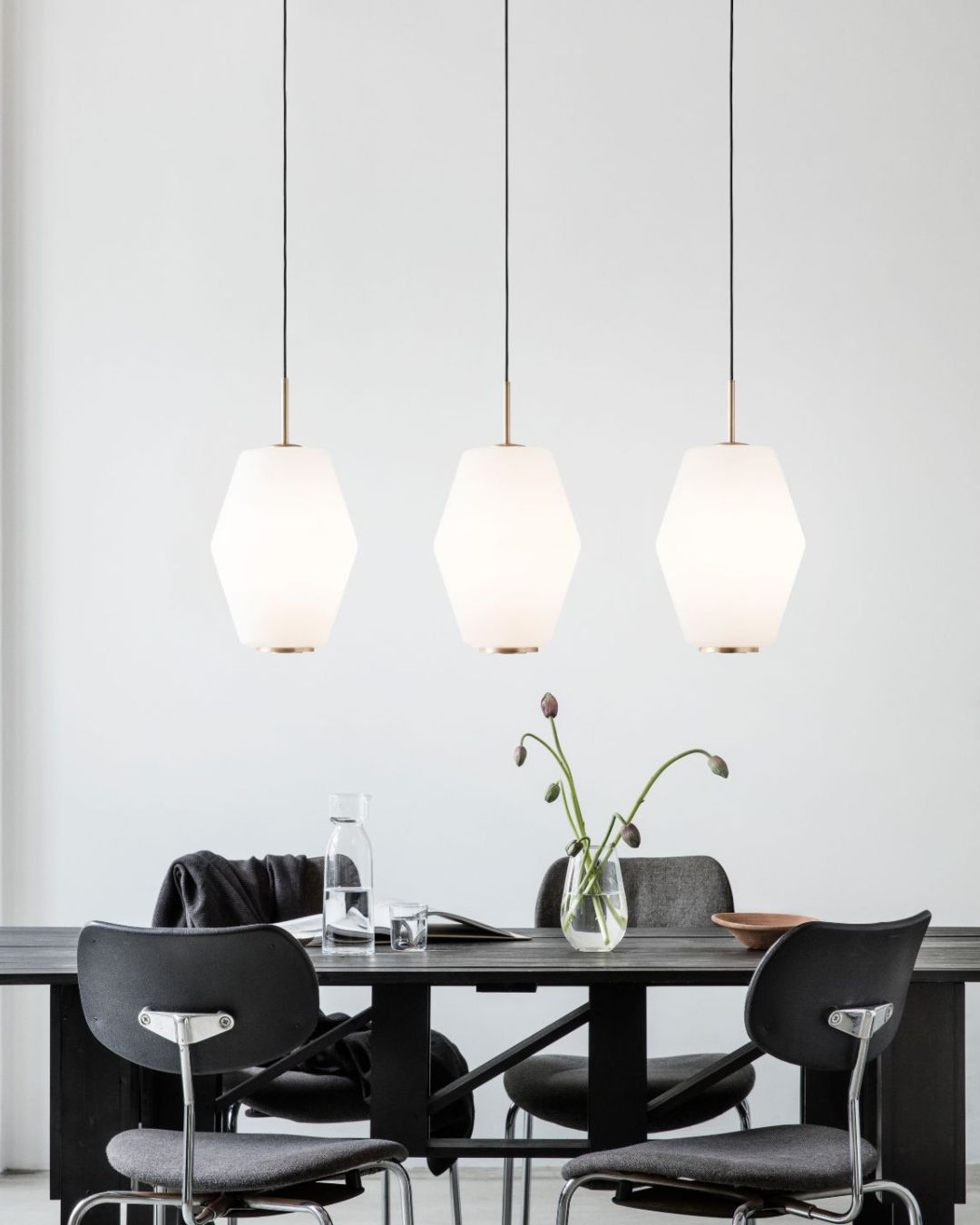 Modern dining area with pendant lights, table, and chairs against a light gray wall.