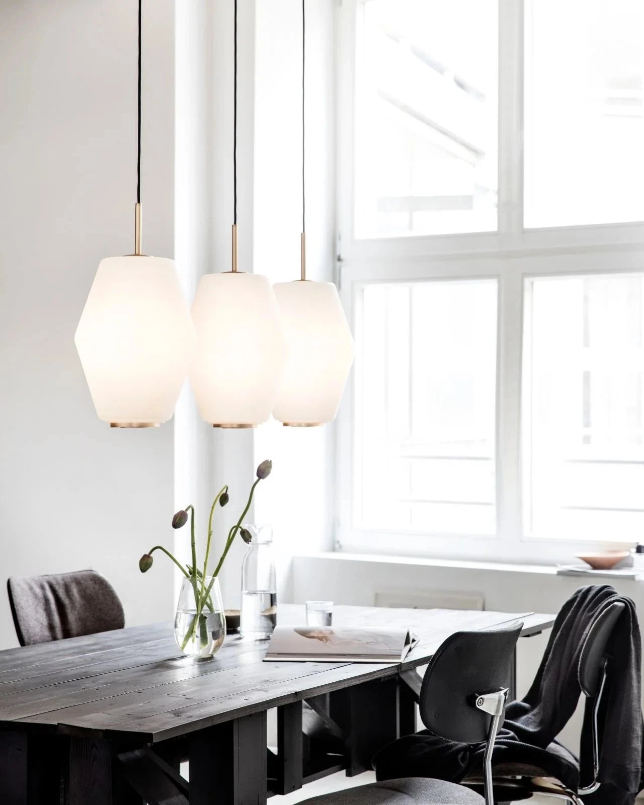 Modern dining room with Scandinavian glass pendant lights, table, chairs, and a large window.