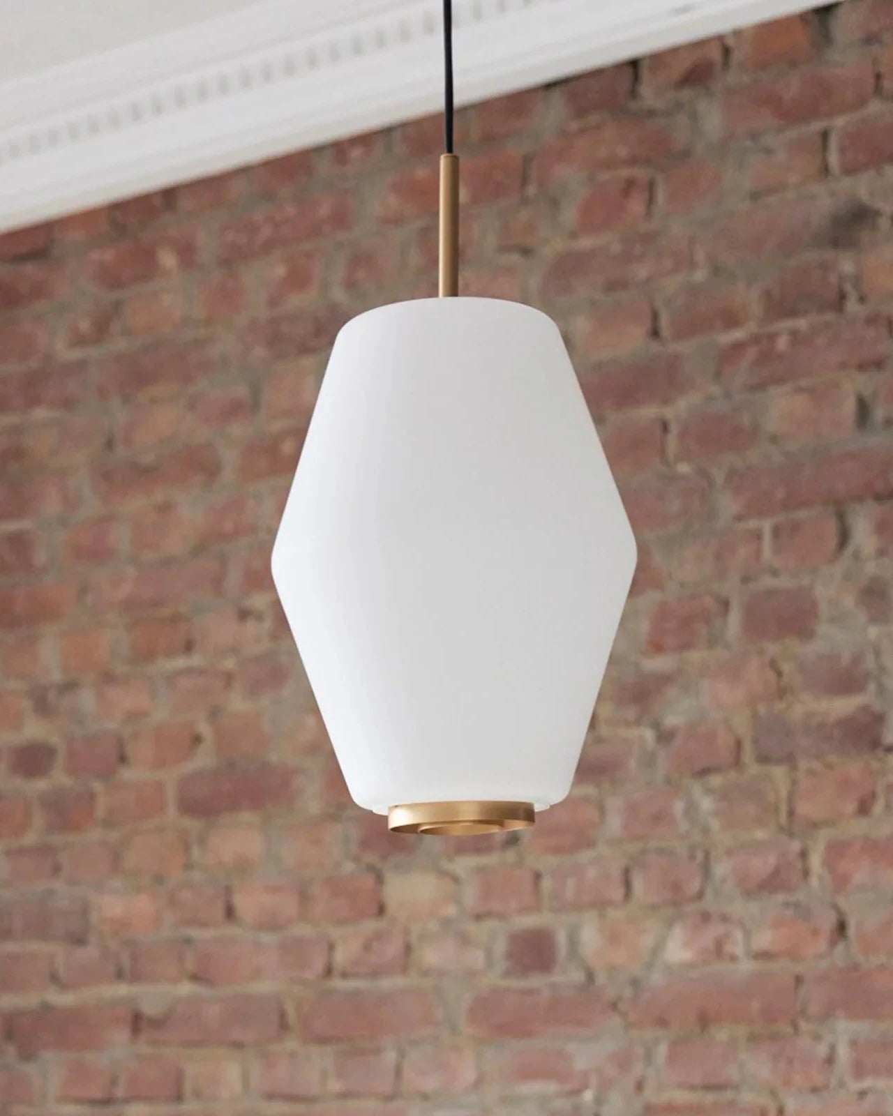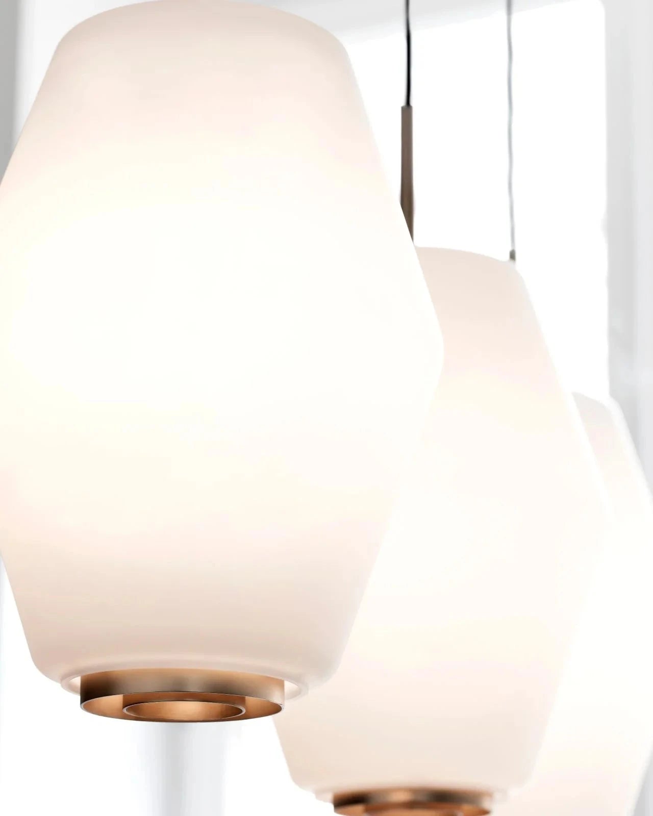 Close-up of a modern Scandinavian pendant light with white glass shade and gold base.