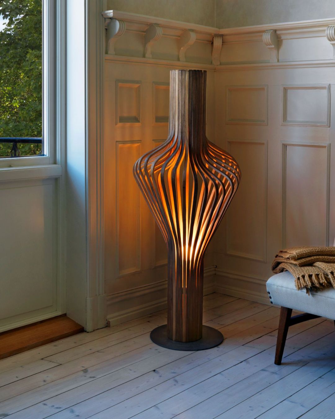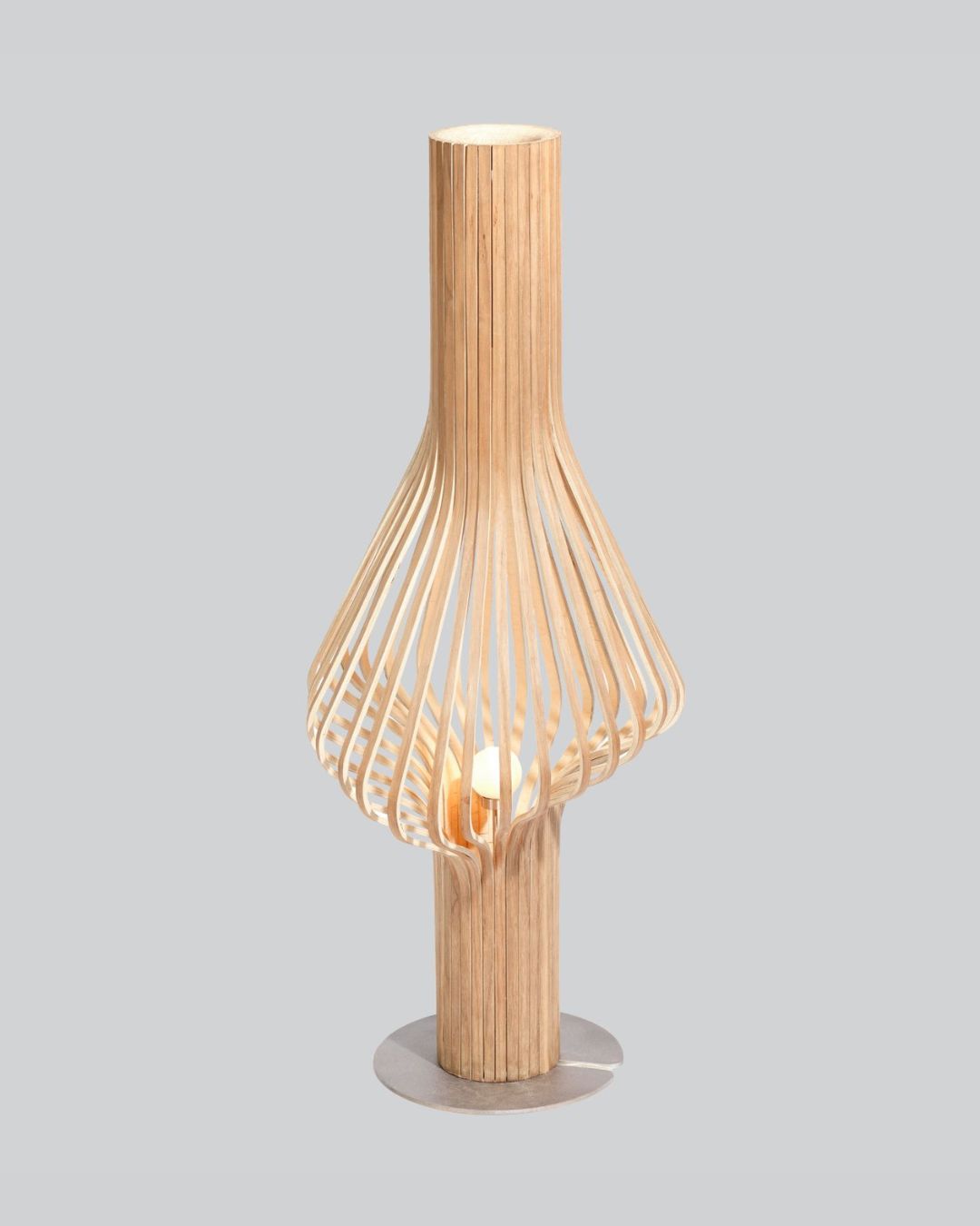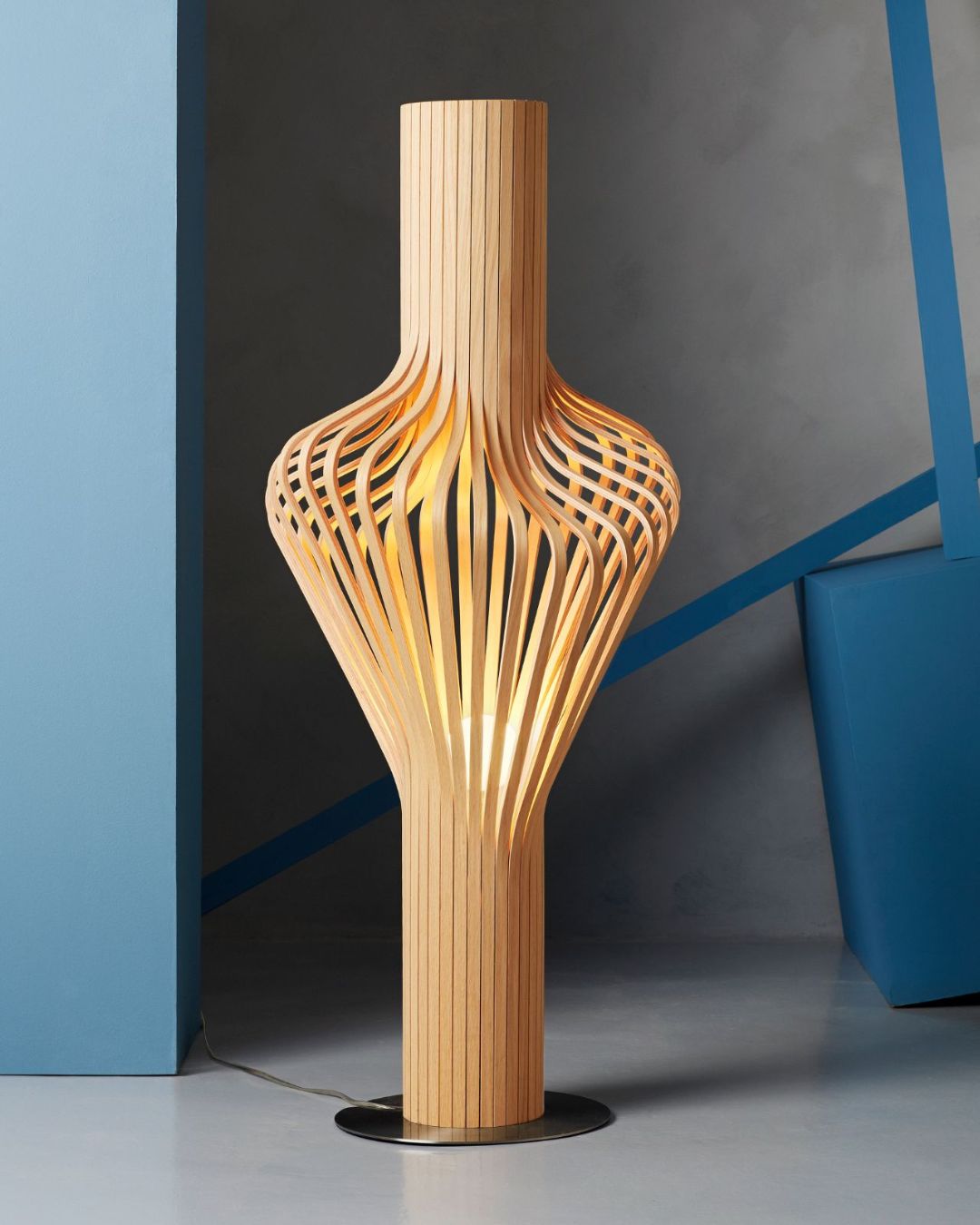 Designed and handcrafted in Norway, its bent shade is composed of 32 individual wood strips, shaped using the traditional techniques of Norwegian laminated wood craftsmanship. Oak and walnut are carefully chosen for their strength and flexibility, allowing the shade to form elegant, sculptural curves.