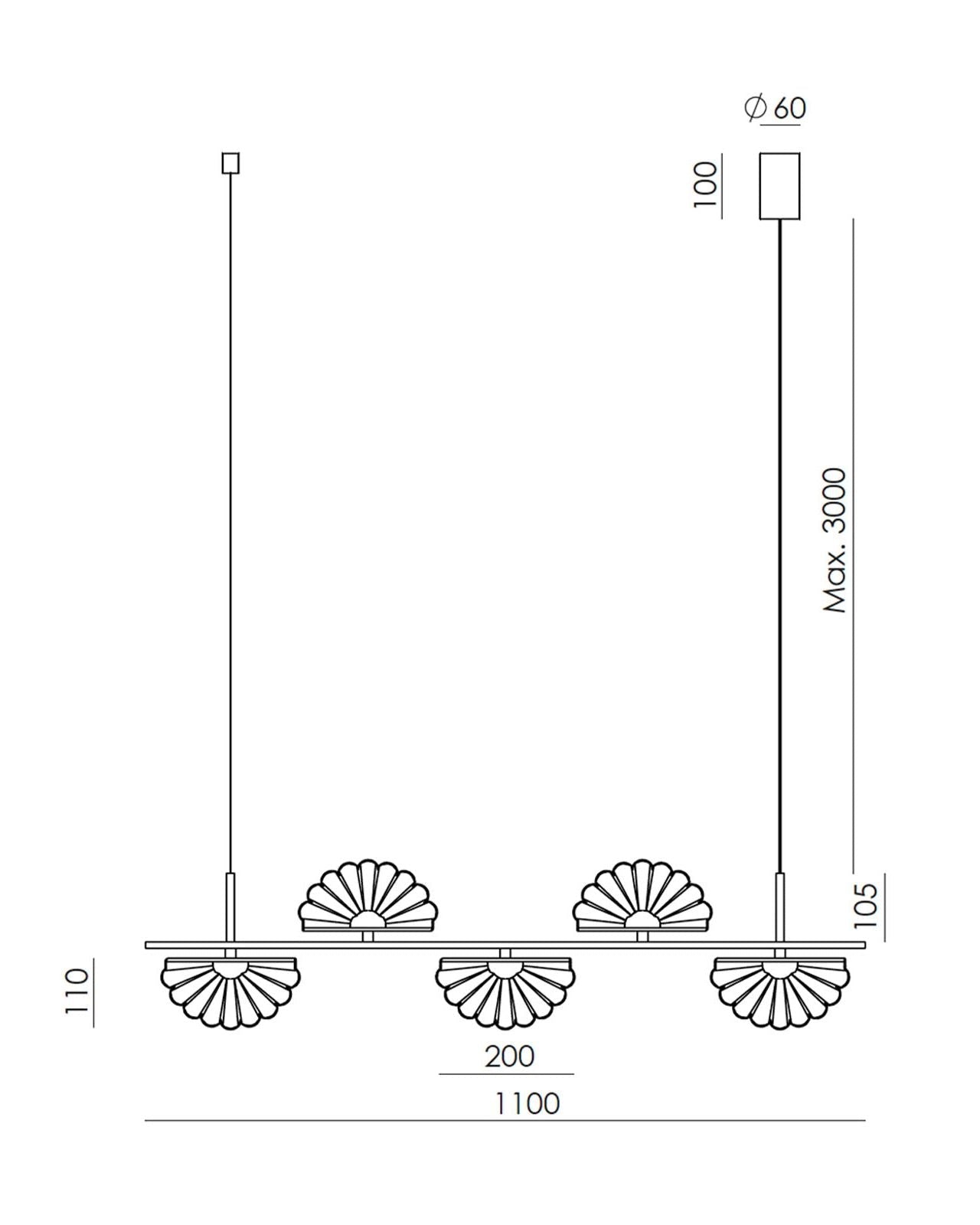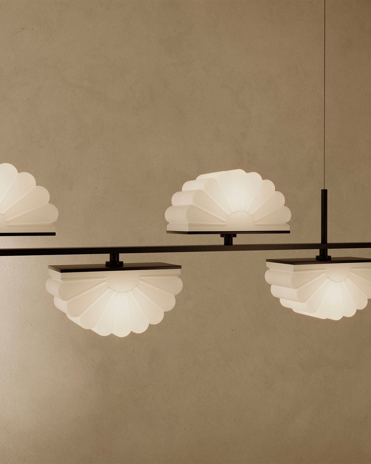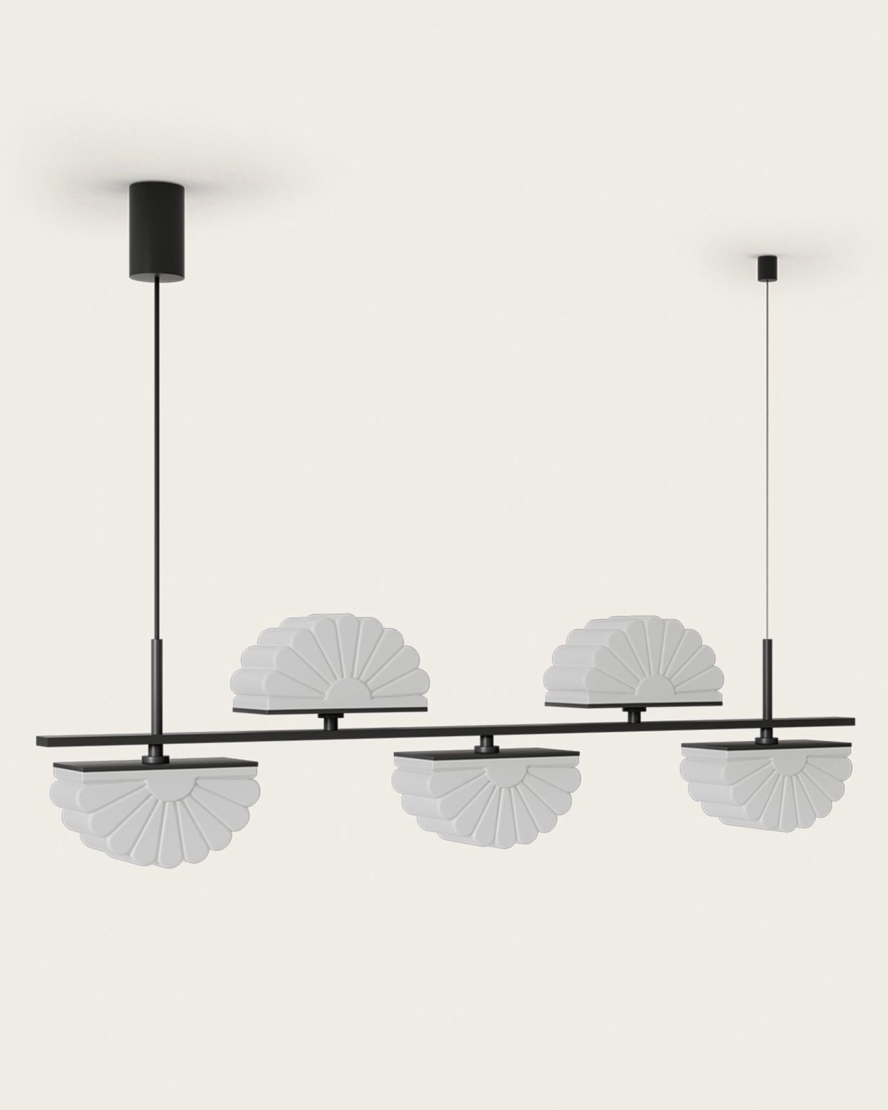 The Semi-Circular Scalloped 5 Light Chandelier is an elegant and sculptural design. It features four shell-like light shades made of white, opaque glass, each with a petal-like pattern. The shades are arranged symmetrically along a sleek, black metal frame, which is suspended from the ceiling by two slim black rods and cylindrical mounts. The design combines Art Deco and contemporary influences, creating a sophisticated aesthetic. The layered structure of the shades diffuses light softly, providing ambient illumination. This chandelier would be an ideal statement piece for dining areas, living rooms, or stylish commercial spaces.