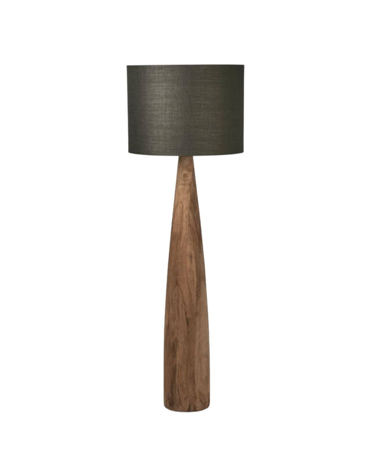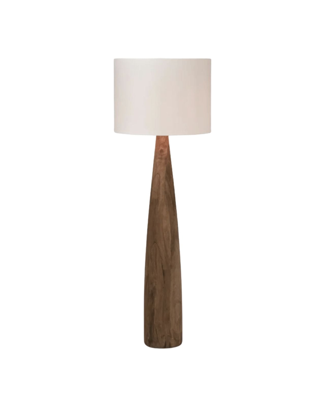 Crafted from durable mango wood, this elegant floor lamp features a tall conical base and a rich saddle stain finish. The rich deep wood boasts a beautiful grain, ensuring longevity and style in any room. The lamp also includes a large linen shade, available in a white, black, or natural finish, adding to the floor lamp's sophisticated style. Perfect for living rooms and master bedrooms.