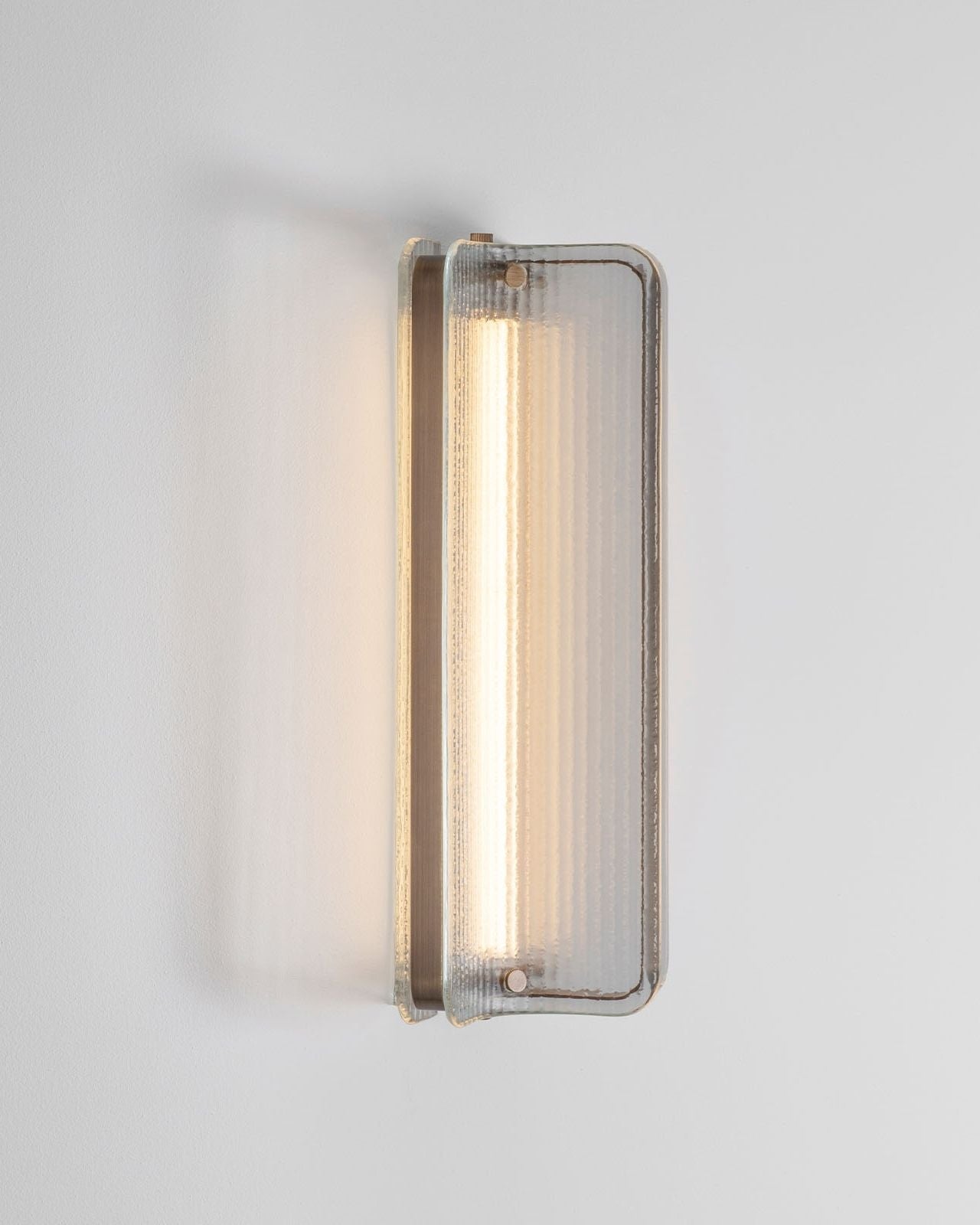 The Textured Reeded Glass Column Wall Light is a sleek and architectural fixture defined by its sharp angles and refined proportions. Crafted from kiln-formed glass, its linear form features a slim, tapered body that casts both upward and downward light, creating a dramatic wash of illumination across the wall. Ideal for hallways, living areas, or contemporary bathrooms, it adds a minimalist yet striking accent that enhances spatial depth and modern detailing.