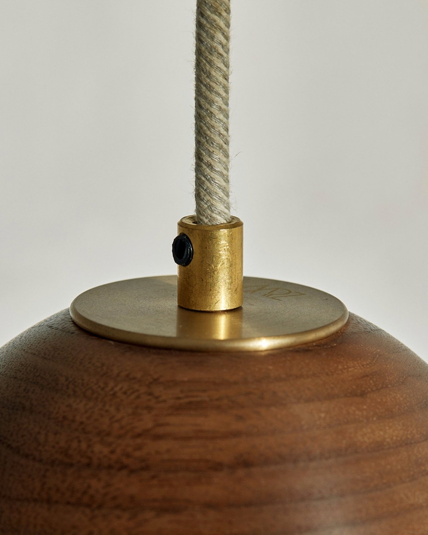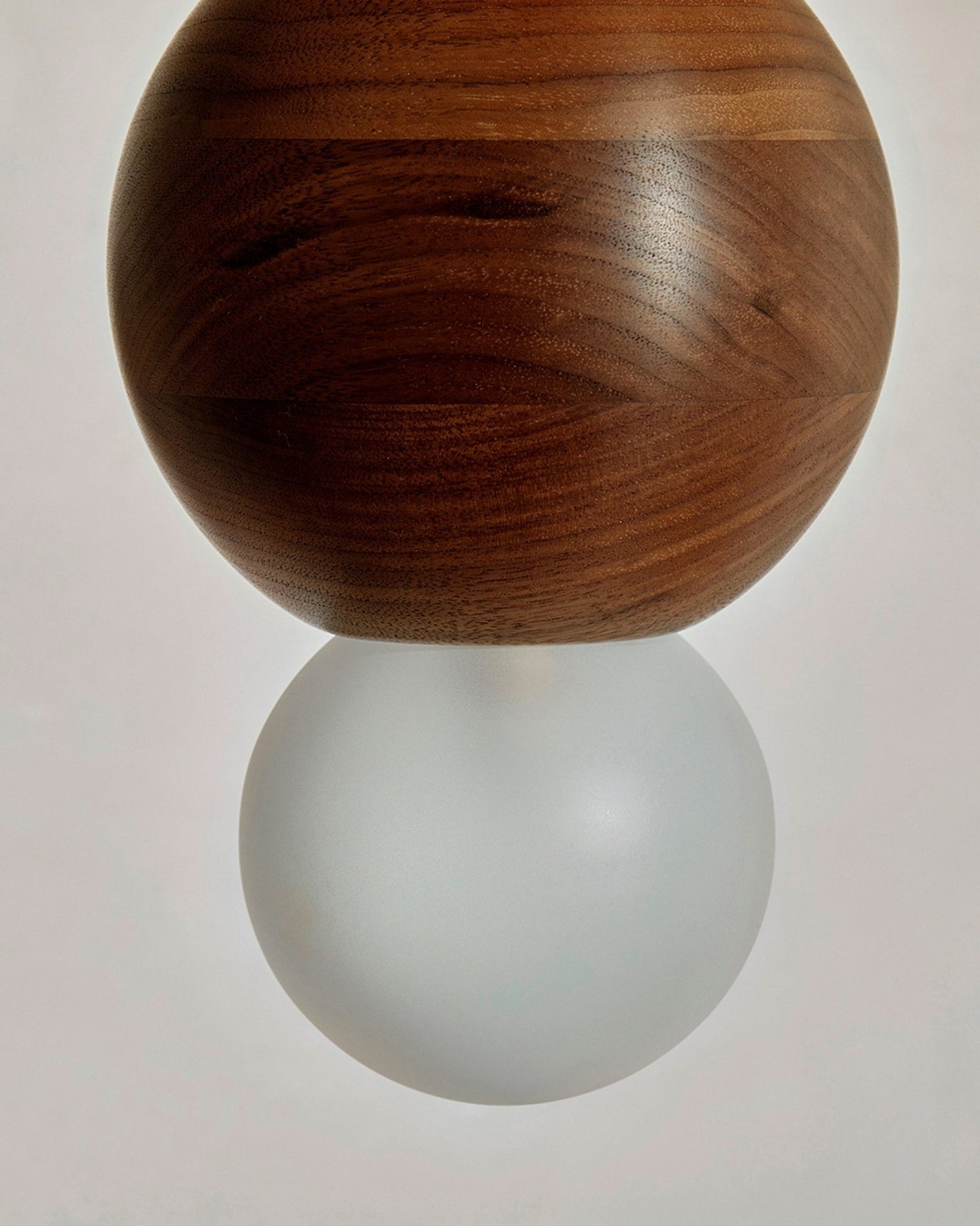 Designed in Australia, this suspended pendant features an oversized timber sphere paired with a glass diffuser and brass detailing. The combined textures and spherical forms add a stunning sculptural element to interior spaces.