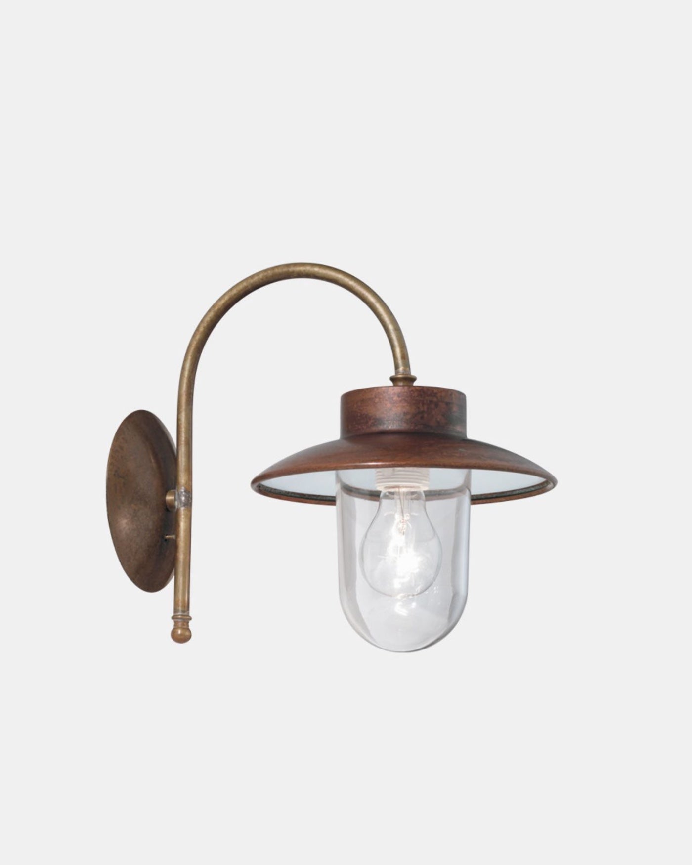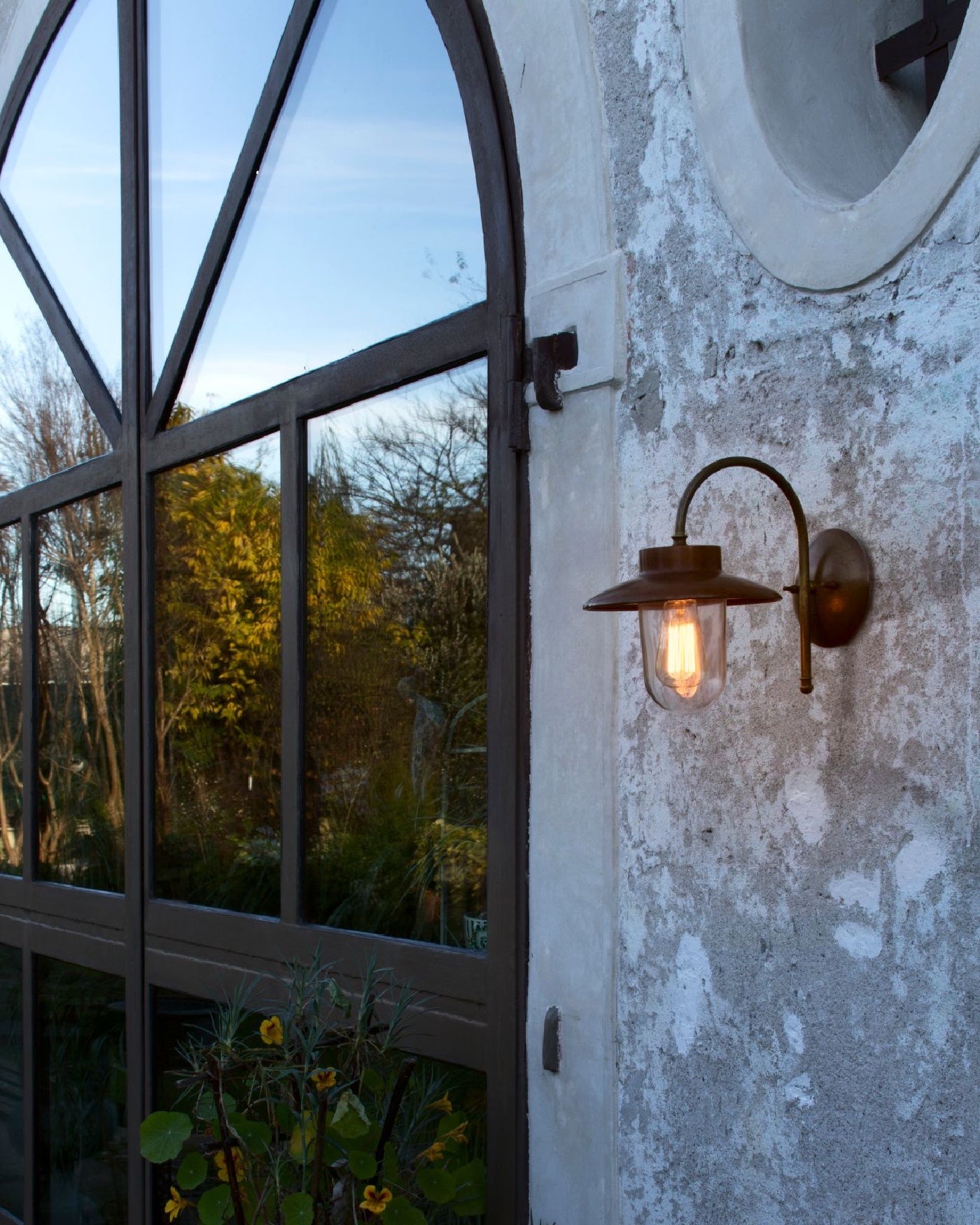 Curved traditional pre-aged brass wall light suitable for exteriors