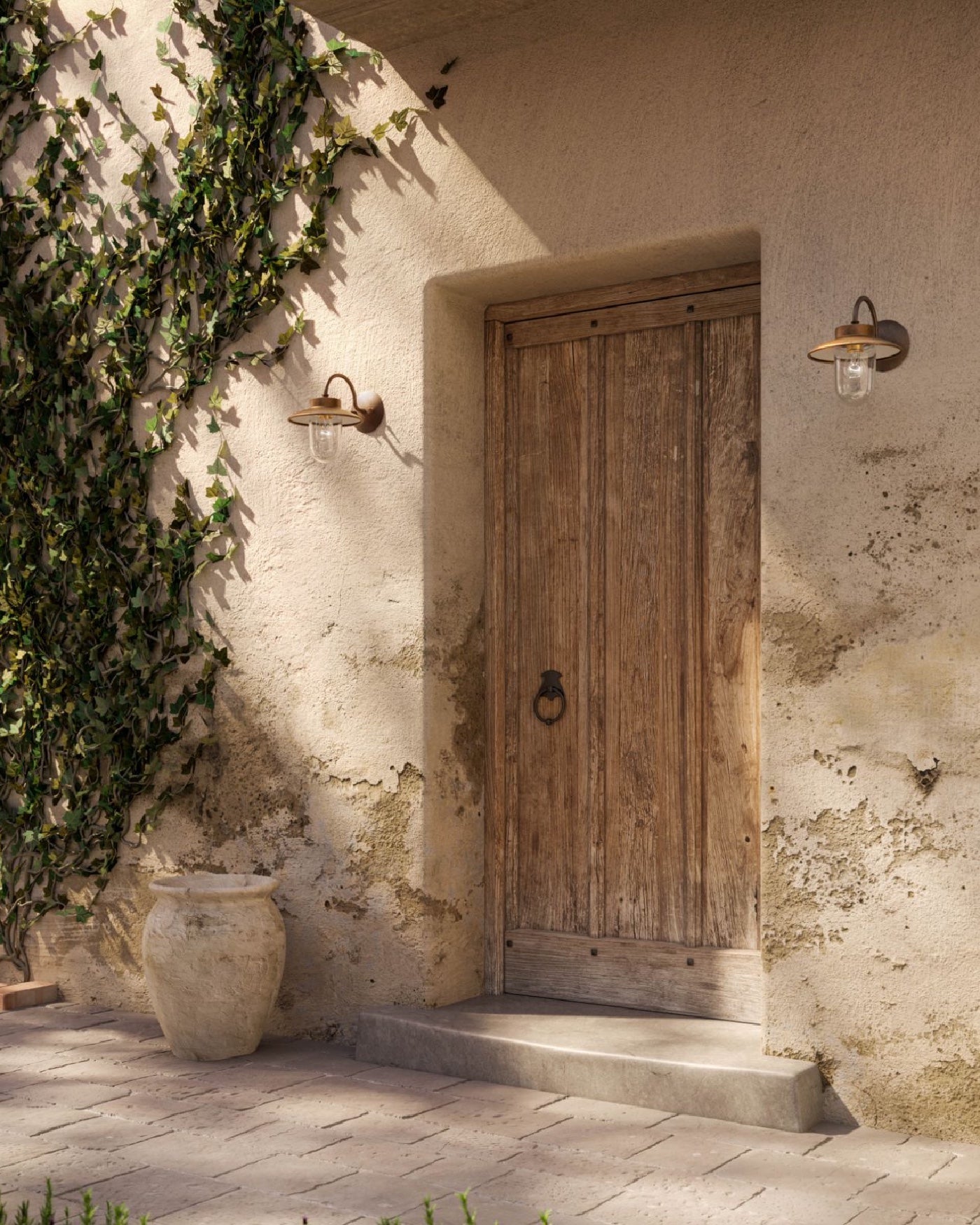 Traditional pre-aged brass exterior wall lights on both sides of a rustic entrance door