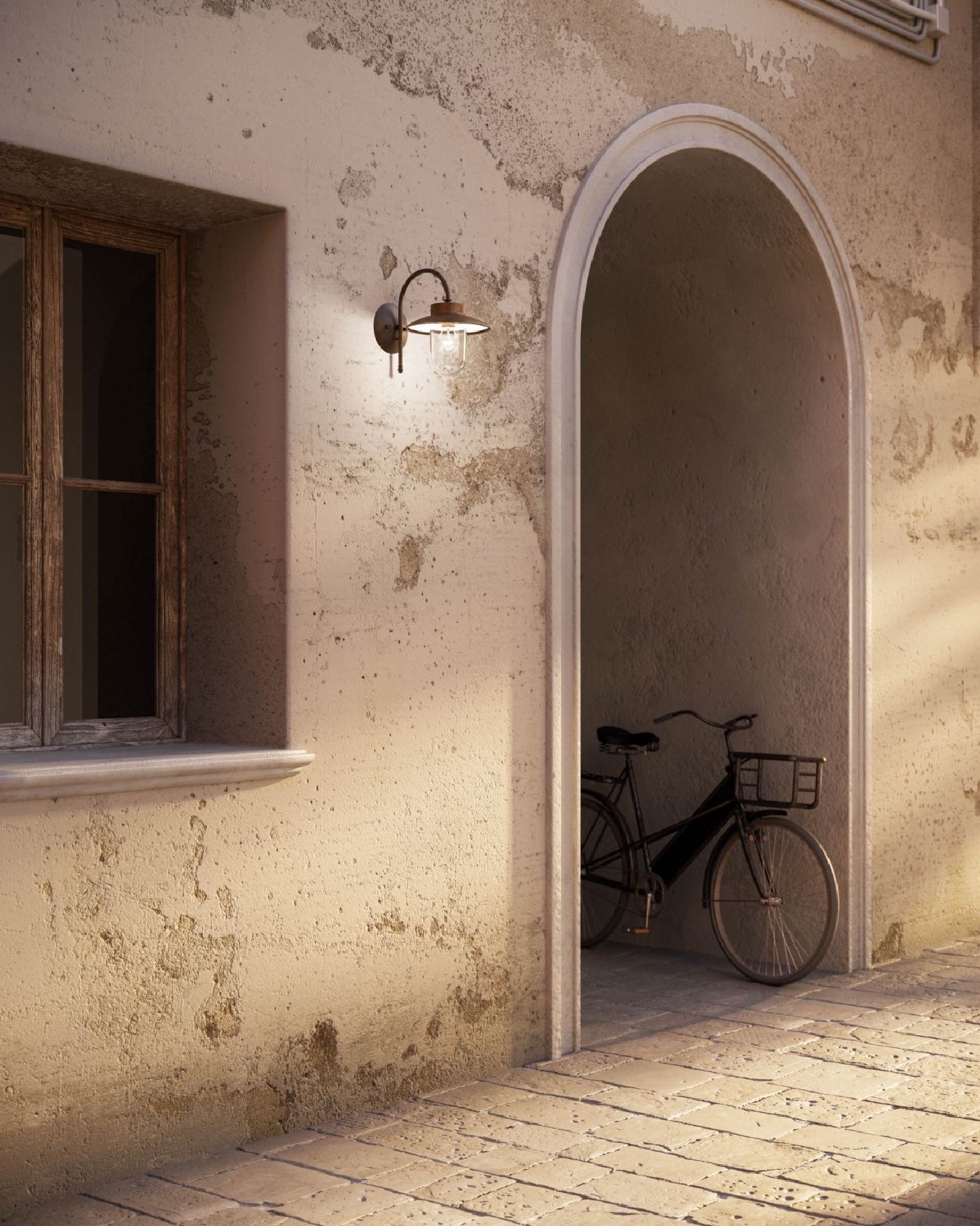 This traditional style exterior wall light is perfect to unite the styles of Industrial and Traditional lighting designs. Created in a pre-aged copper and brass finish. The overhang and clear diffuser adds a European city feel to your exterior walls, emitting a warm glow.