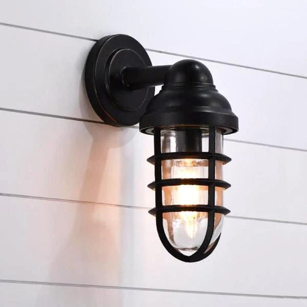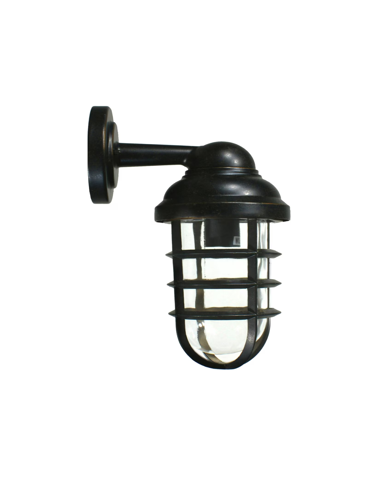 Drawing on vintage charm, this wall light features a cage-encased glass dome reminiscent of dockside lanterns from bygone eras.