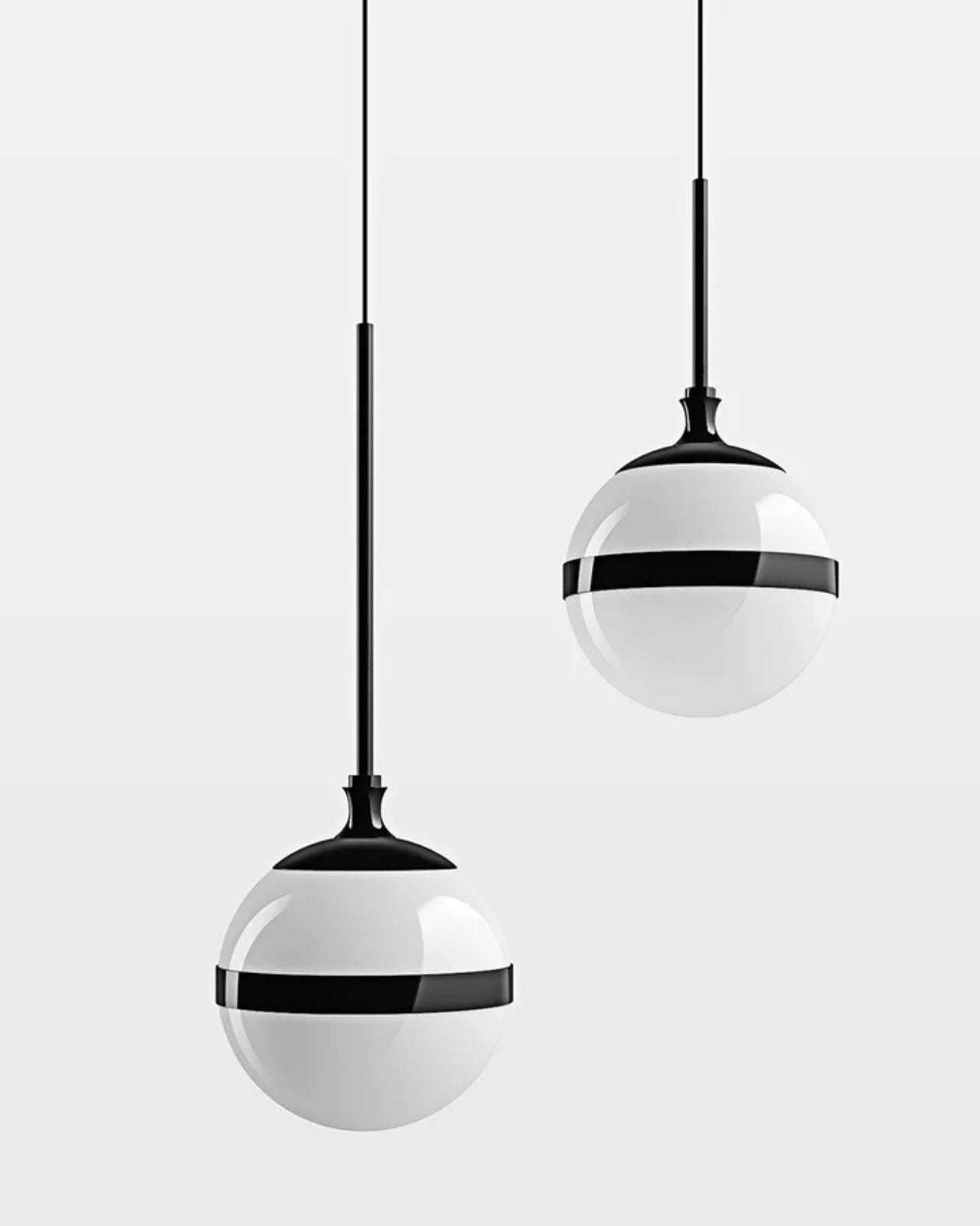 This unique elegant pendant light depicts a contrast between black and white with a well balanced, proportional design. A white mouth-blown glass sphere is complemented by a glossy black metal frame with a lead-effect treatment for a modernist aesthetic.